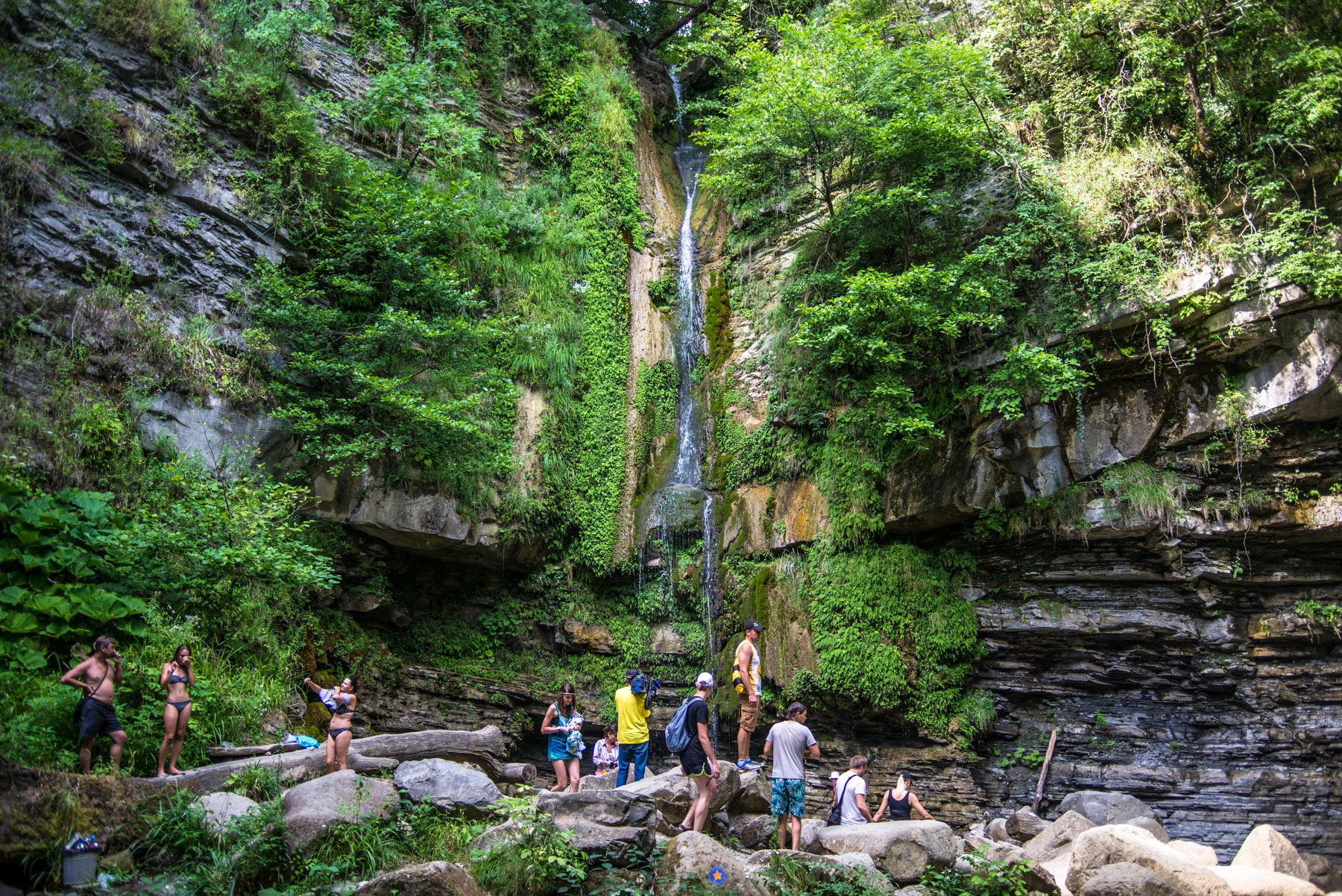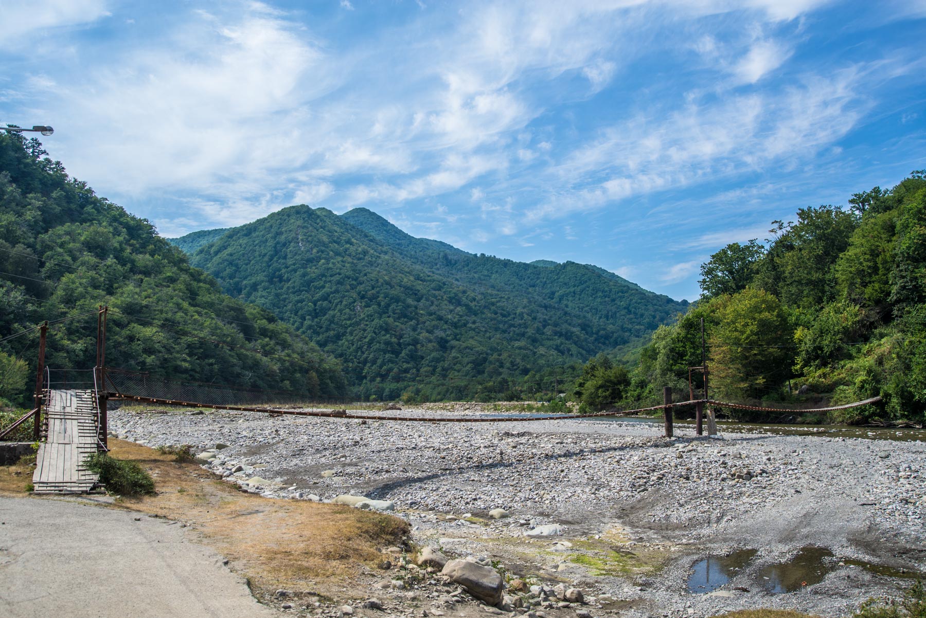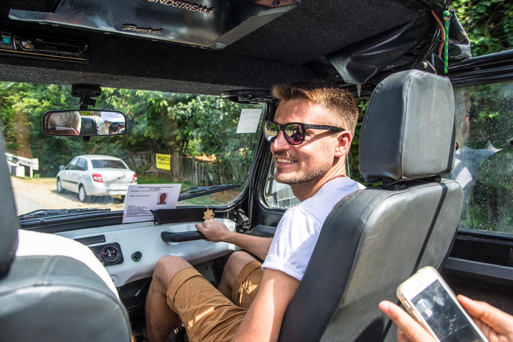 Следующий день обещал быть непохожим на предыдущие. Во-первых, мы должны были ночевать на базе отдыха в горах, а во-вторых, наконец заняться чем-то активным, а не только любоваться архитектурой и пейзажами. Этим активным стал джиппинг. 5 машин, 30 человек, громкая музыка, большие колеса. Из поселка Солоники, в котором мы остановились, водители провезли нас через Лазаревское, пересекли аул Тхагапш и по небольшому отрезку бездорожья довезли до водопада Игристый. Дальше по плану – купание в лазурного цвета реке Псезуапсе. Вот тут-то и случилась неожиданность. Всех водителей внедорожников, кто проехал через русло реки, тут же остановили ребята из природнадзора. Ездить по реке нельзя, оказывается. Водитель позднее рассказал, что отделались предупреждением. Также он поделился, что проверяющих натравил на наш экипаж арендатор водопада Водолей, мимо которого мы проехали, не дав тому поднять деньжат на несколько тысяч рублей. Вот такая месть по-сочински.