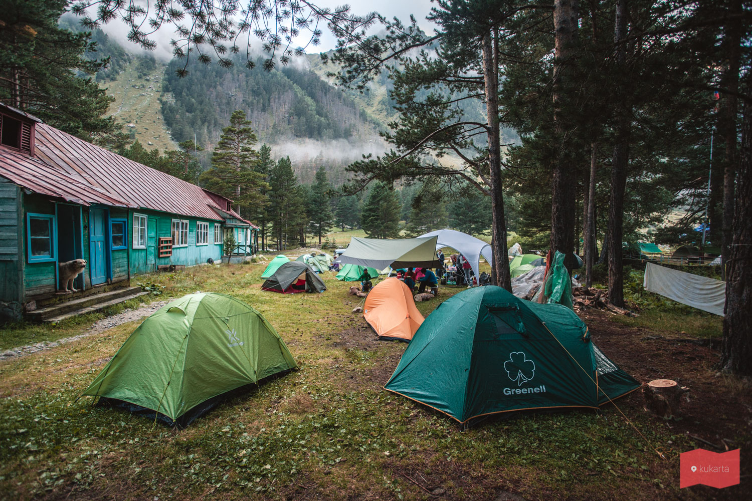 На территории есть столовая, кафе, умывальники, общий душ и баня, туалет, пункт проката снаряжения и спортплощадка. Жить можно в своей палатке либо в деревянном домике на несколько человек с удобствами на свежем воздухе. Проживание в своих палатках здесь стоит 250 руб с человека, комнату без удобств можо снять за 1000 рублей (цены актуальны на 2020 год)).