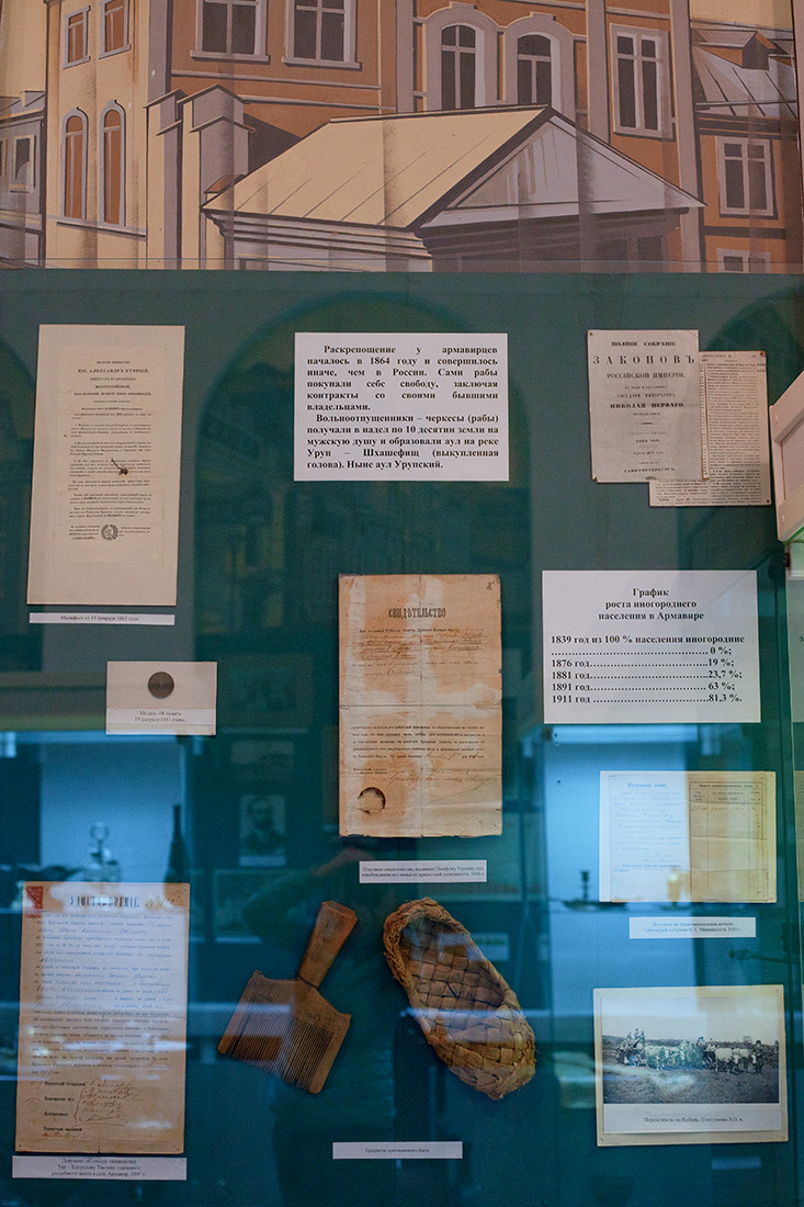 Повторяя судьбу разрушенных войной музеев, Армавирский краеведческий был восстановлен в самые скорые сроки после её окончания. И с тех пор музей знакомит посетителей со своими археологическими выставками. Тут представлено и золото скифов, и оружие сарматов, и кости доисторических мамонтов. Имеется также выставка самоваров, все экземпляры которой дееспособны. В недрах музея хранится подшивка древнерусских книг и журналов – рукописных и старопечатных, благодаря которой можно познакомиться с развитием издательского дела на Руси.