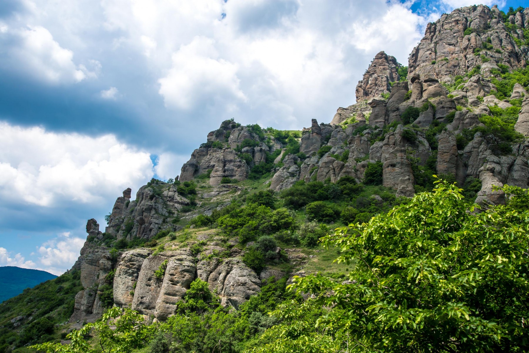 В переводе с крымскотатарского название горы означает “кузнец”. У горы две вершины — Северная Демерджи (1356 м) и Южная Демерджи (1239 м). Чаще туристы посещают южную вершину. На этом маршруте много интересных объектов: Долина привидений, Голова императрицы Екатерины Второй и пр.