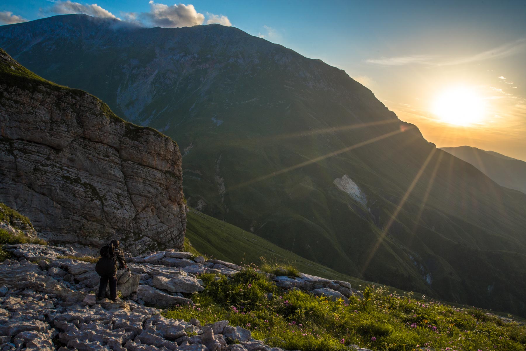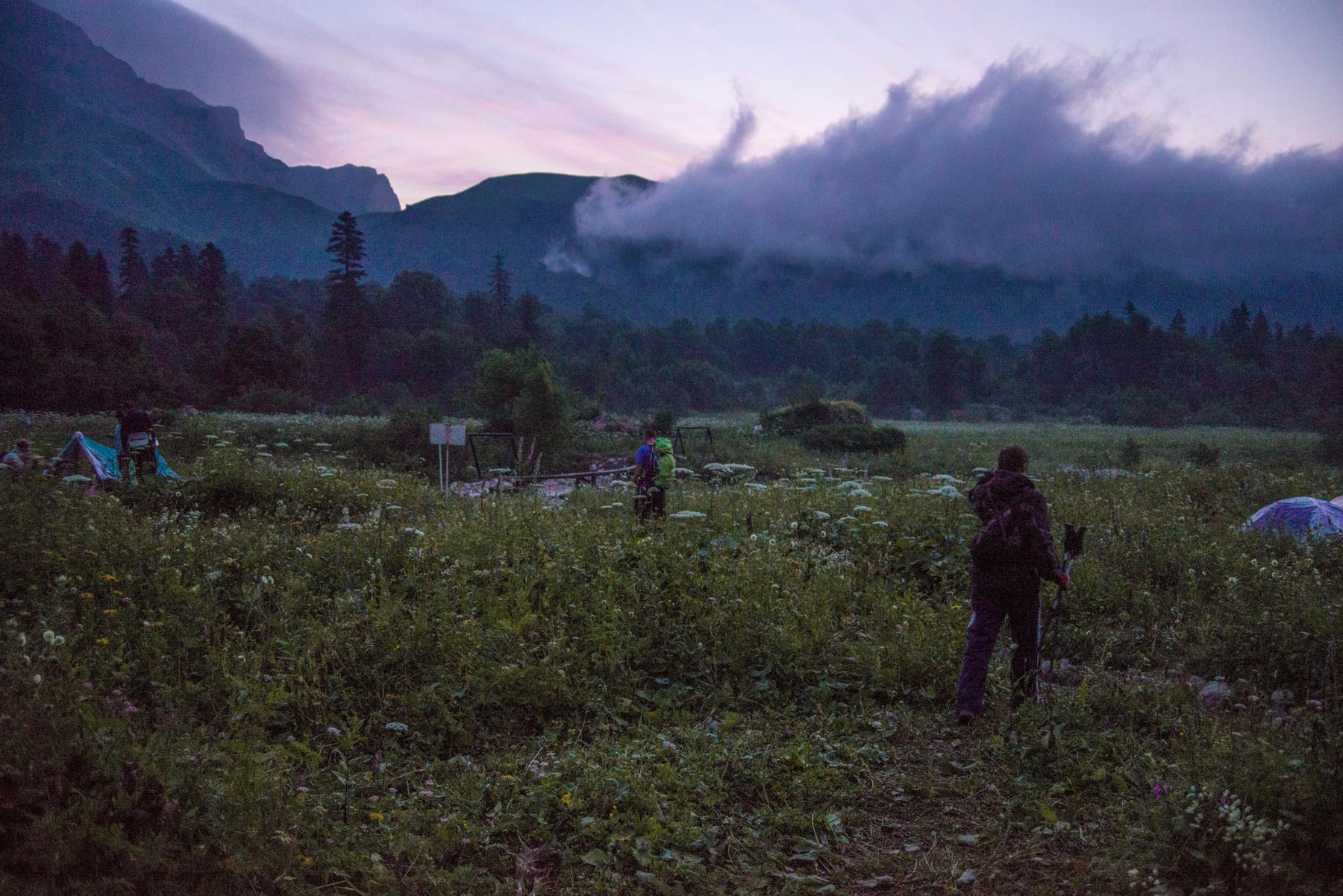 На высокой траве много росы, поэтому мы моментально становимся мокрыми. Но на улице жарко даже в такую рань, поэтому намокшая одежда никого не смущает. Первые лучи солнца уже пытаются пробиться к нам через Армянский перевал, окрашивая небо в нежные цвета.