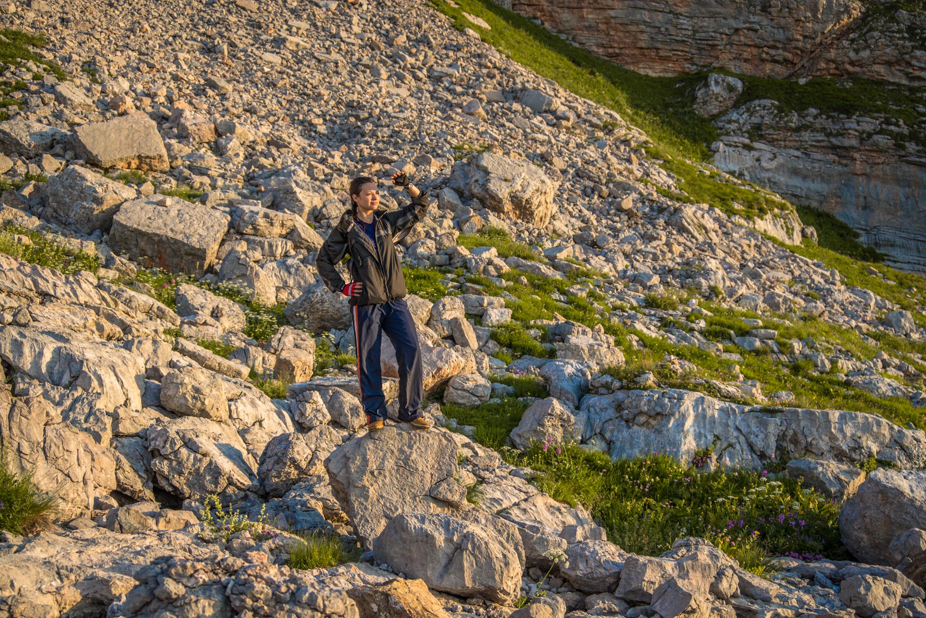 А это наш товарищ, у него разорвались оба ботинка, поэтому он не попал сегодня на вершину, сидит в травке, отдыхает.