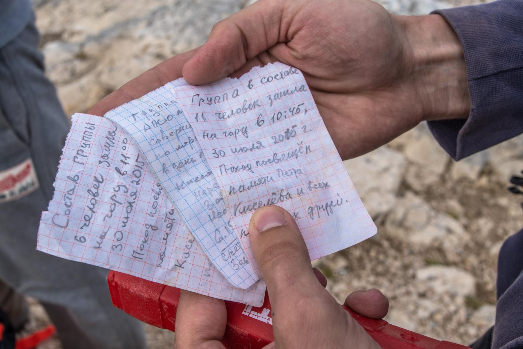 Читаем те самые записки поднявшихся на гору 30 июля. Здесь есть фотографии, но этот мужчина не похож на Петра Киселева. На карточках нет никакого разъяснения, к сожалению.