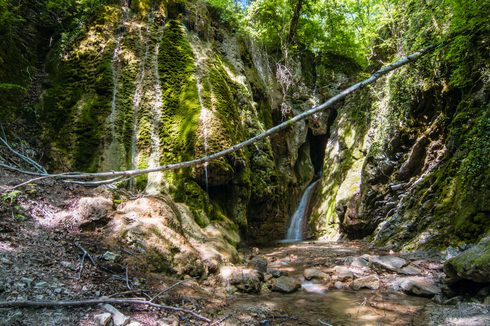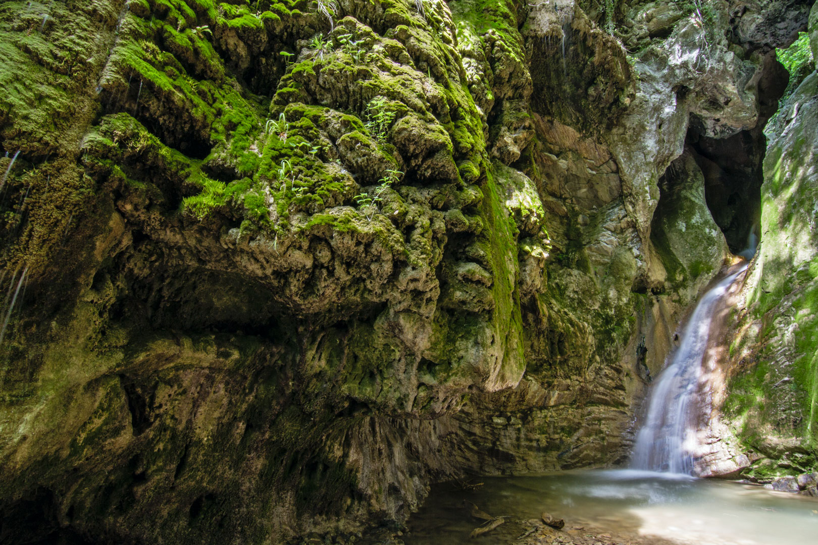 Водопад действительно находится в глубине скал, чтобы подобраться поближе, придется пройтись по скользким камням.