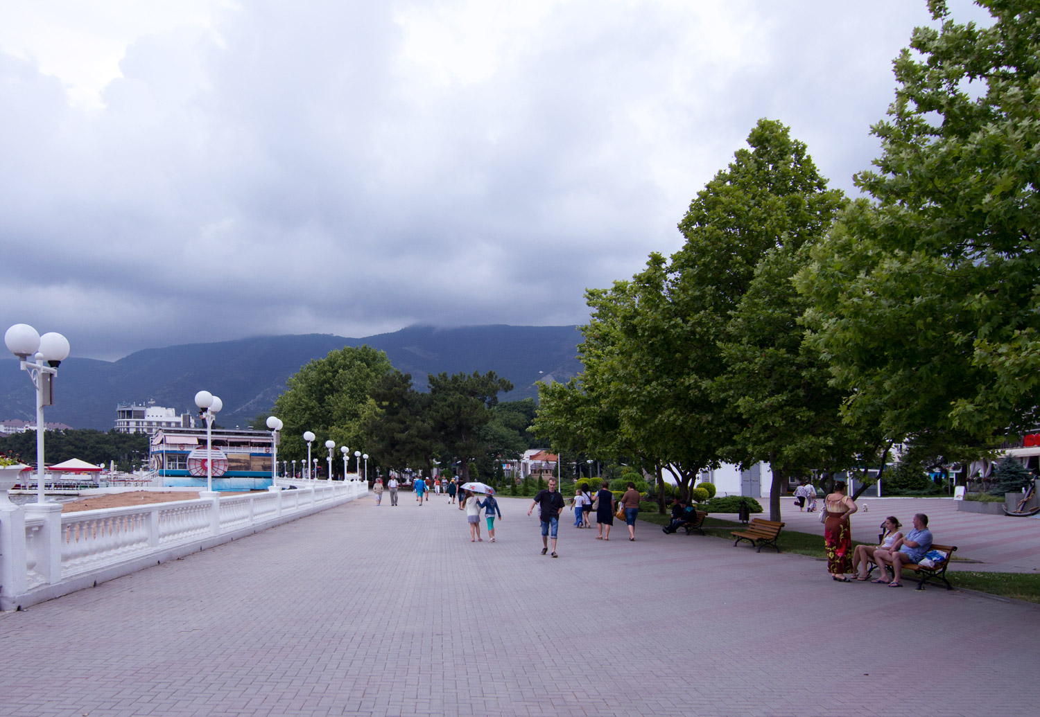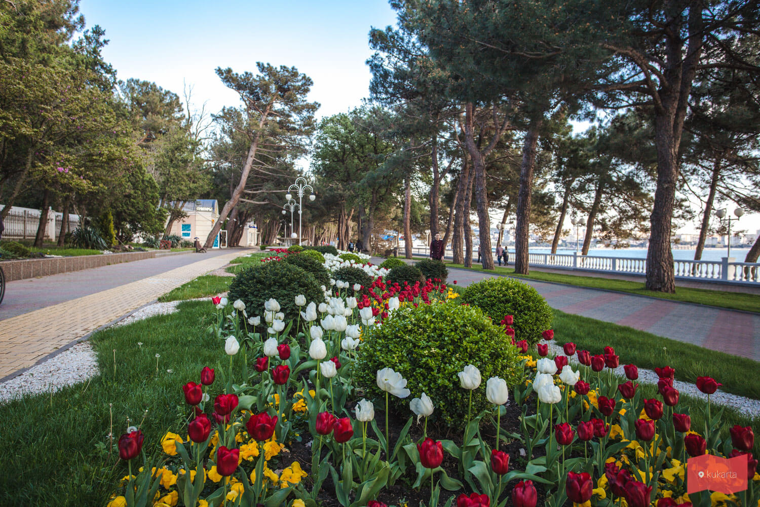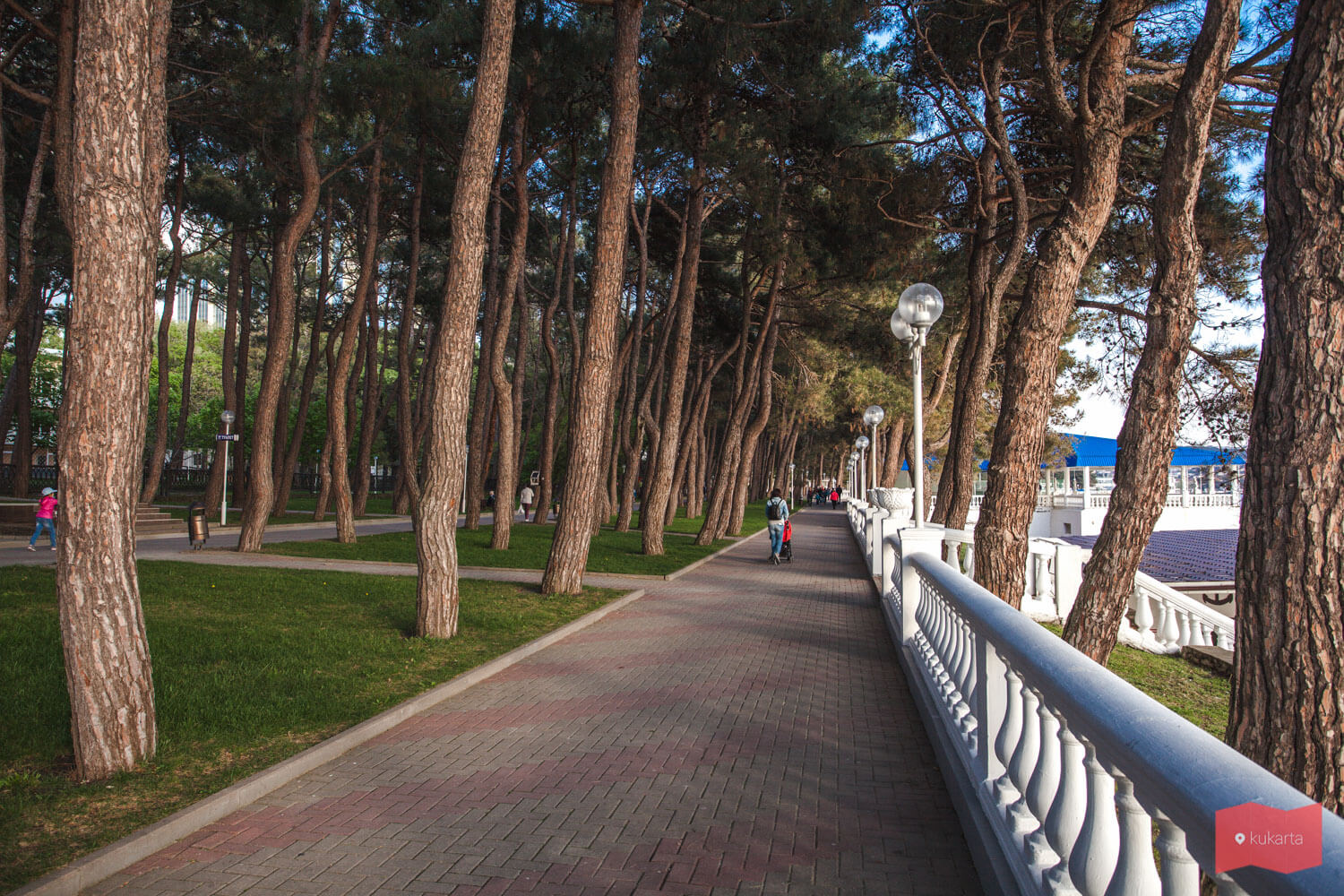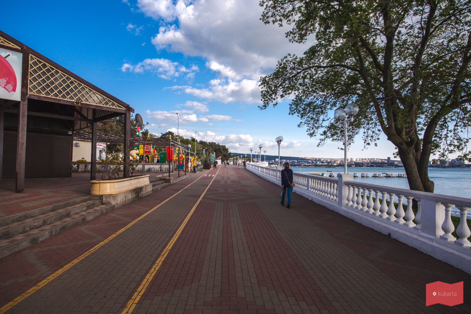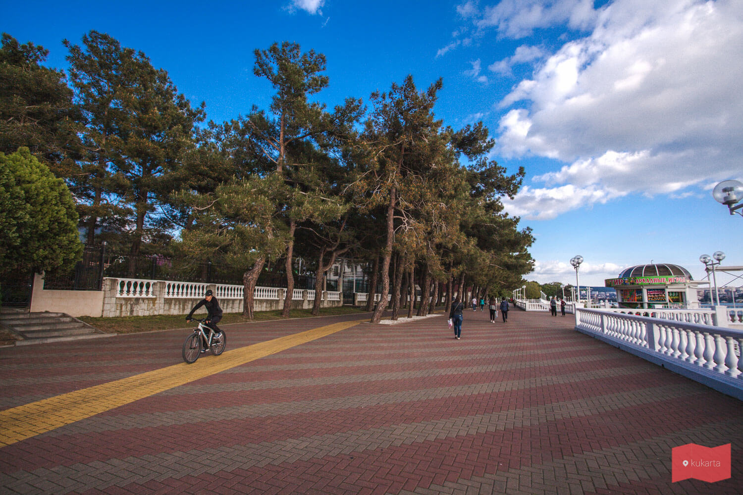 Чистая и благоустроенная, она привлекает сюда туристов и в межсезонье. Как и другие улицы города, набережная усажена соснами, которые распространяют хвойный запах и создают приятную тень в зной. Набережная закрыта для автотранспорта — это вотчина пешеходов и велосипедистов, для которых, кстати, проложена отдельная дорожка и работает велопрокат. Встречаются на набережной детские городки и зоны для занятий воркаутом.