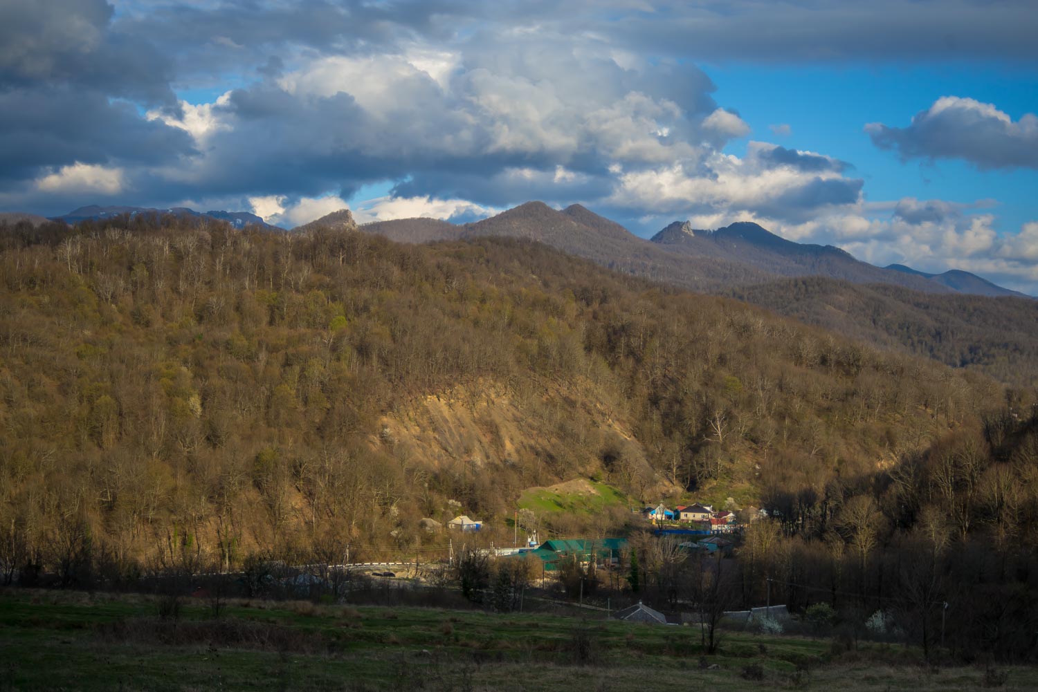 Если вы едете из Краснодара, то в самом ауле Малое Псеушхо перед мостом через реку Тхашомчук сворачивайте направо. Машину можно оставить прям здесь и подниматься вверх по грунтовой улице поселка. Когда последние дома закончатся, дорога совсем испортится. Здесь она поворачивает вправо, проводит путника через широкую поляну, с которой открываются виды на поселок Малое Псеушхо и горы Туапсинского района вдали – Индюк, Семашхо, Два Брата, Семиглавая.
