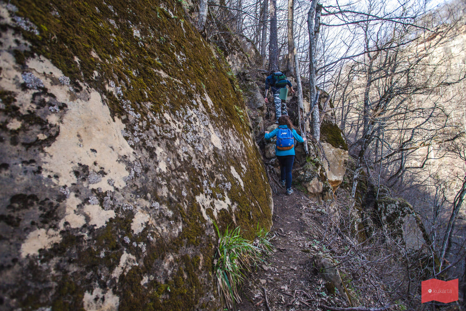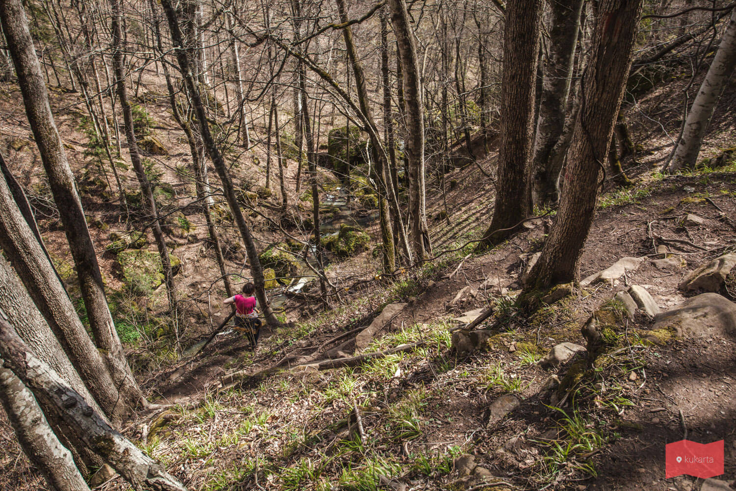 В определенный момент тропа снова разветвляется. Если пойти прямо, то можно выйти к двухкаскадному водопаду на реке Кутанка. Тропа к гроту Крыло ангела будет уходить наверх.