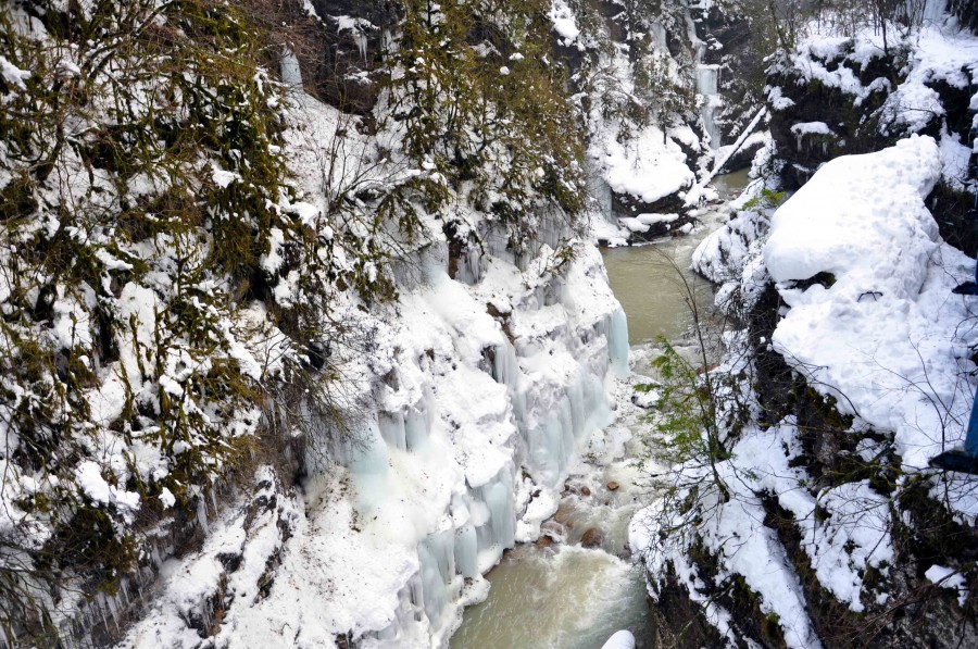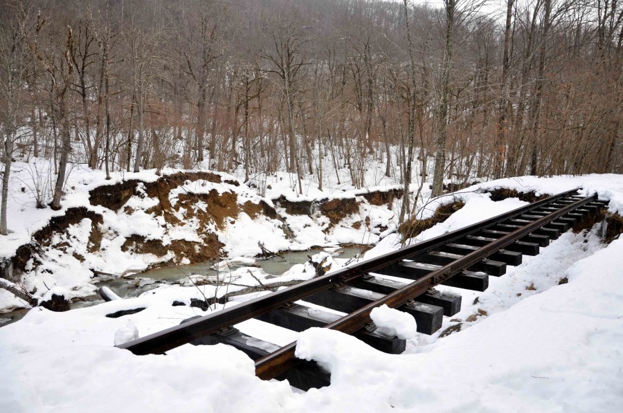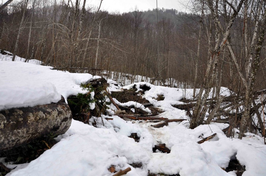 В дневное время на определенном участке узкоколейки ходит поезд, поэтому проход пешеходов запрещен. Однако с утра и вечером никаких препятствий нет. После того, как скалы ущелья заканчиваются, весь оставшийся путь лежит через лес. Курджипс течет здесь уже спокойнее и шире. Почти сразу мы обнаружили место оползня, который случился здесь в 2011 году, железную дорогу смыло — осталось сплошное месиво из камней и стволов деревьев. Кое-как пробрались через этот хаос, даже один раз пришлось подлазить под огромное дерево.