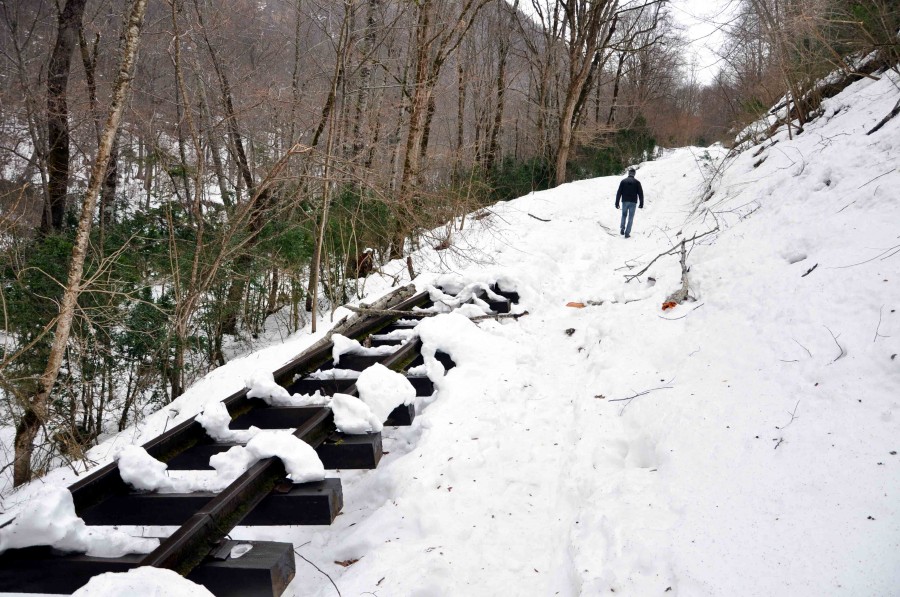 После шли уже по железной дороге, которая только иногда показывалась из-под снега. По снегу идти тяжело, к тому же здесь он не сильно утоптанный. Тем не менее, путь до Мезмая занял ровно 50 минут. И столько же обратно.