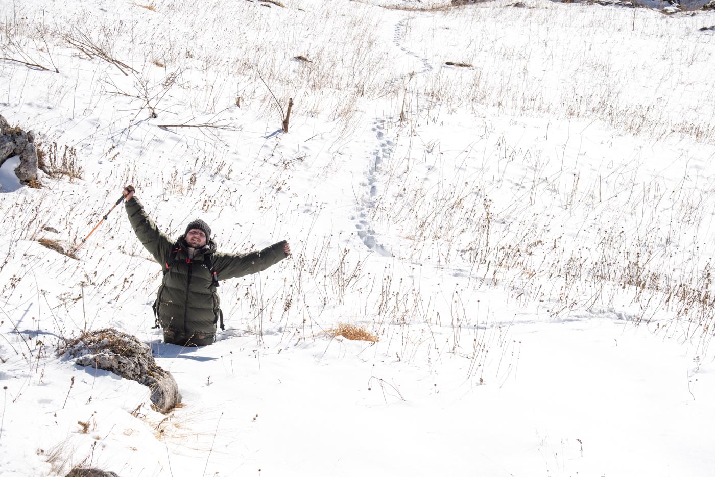 Снег. Много снега. Идти по нему тяжело, особенно если приходится прокладывать путь по снежной целине. Только из-за снега скорость движения снижается сразу в 3-4 раза. В итоге то расстояние, которое летом мы преодолевали за 30-40 минут в этот раз съело 3 часа. Из-за того, что невозможно не увязнуть в снегу по колено, ноги большинства участников похода промокли насквозь.