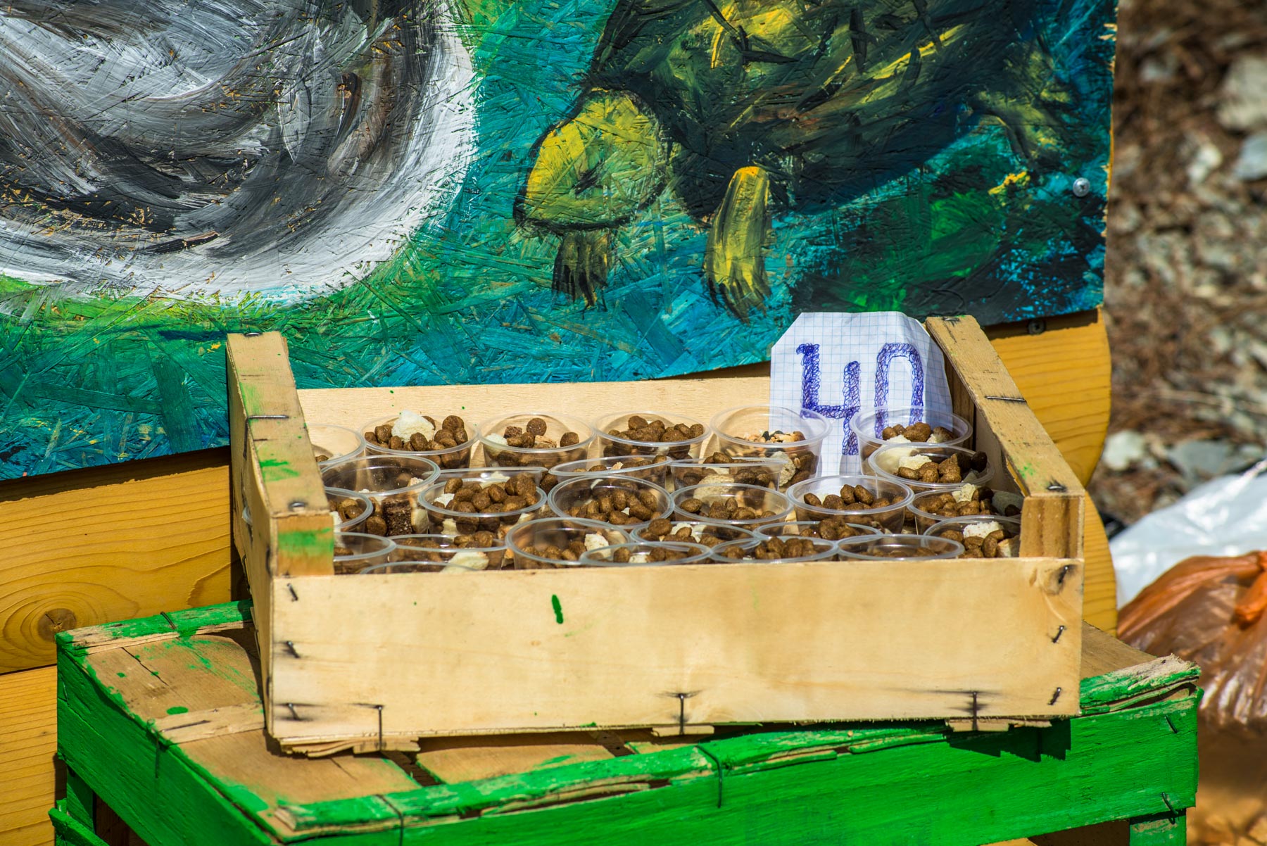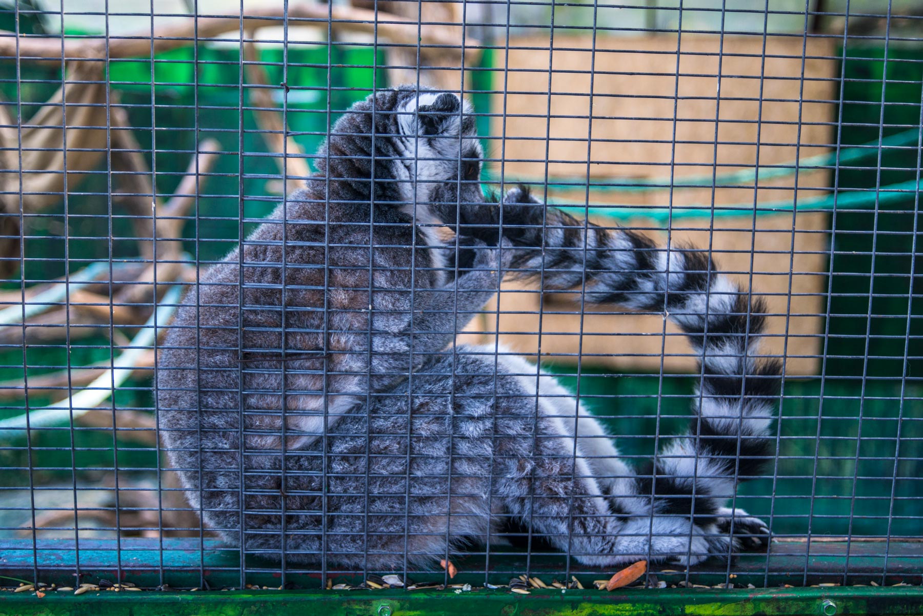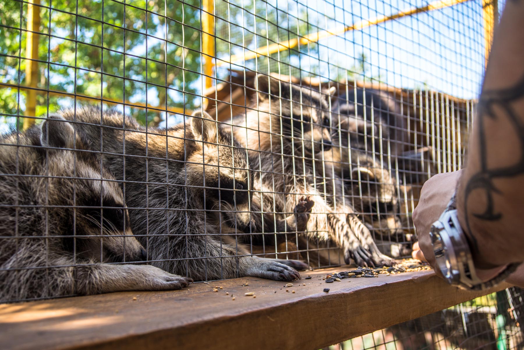 Эти полосатые ребята находятся в отдельном вольере. Енотики выглядят не голодными, но за еду, которую приносят туристы, все равно дерутся между собой.