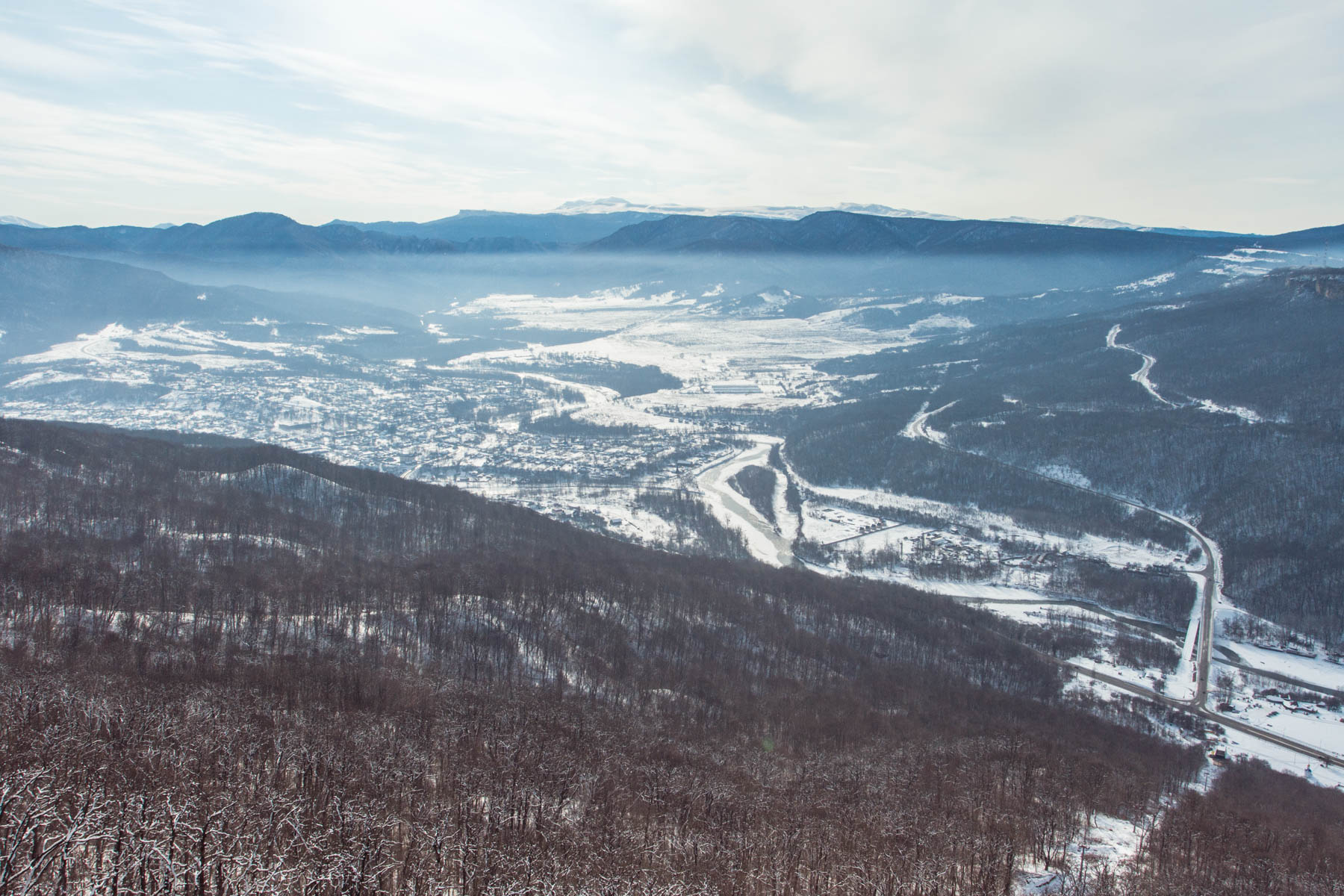 Сверху хребта Уна-Коз, куда и ведет дорога – открываются шикарные виды. Отсюда видно станицу Даховскую, хребет Азиш-Тау.