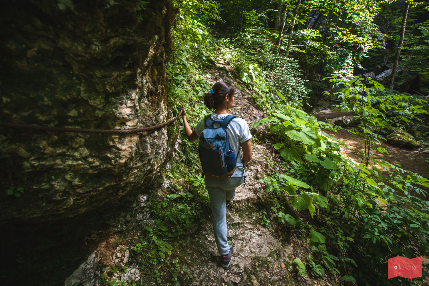 Сам каньон тихий и спокойный, мы не встретили здесь ни одного человека за наше посещение. Но люди тут бывают, тропа маркирована, местами натянут трос для подстраховки. Фото сделаны в начале августа, в это время воды в реке немного, передвигаться можно без сапог.