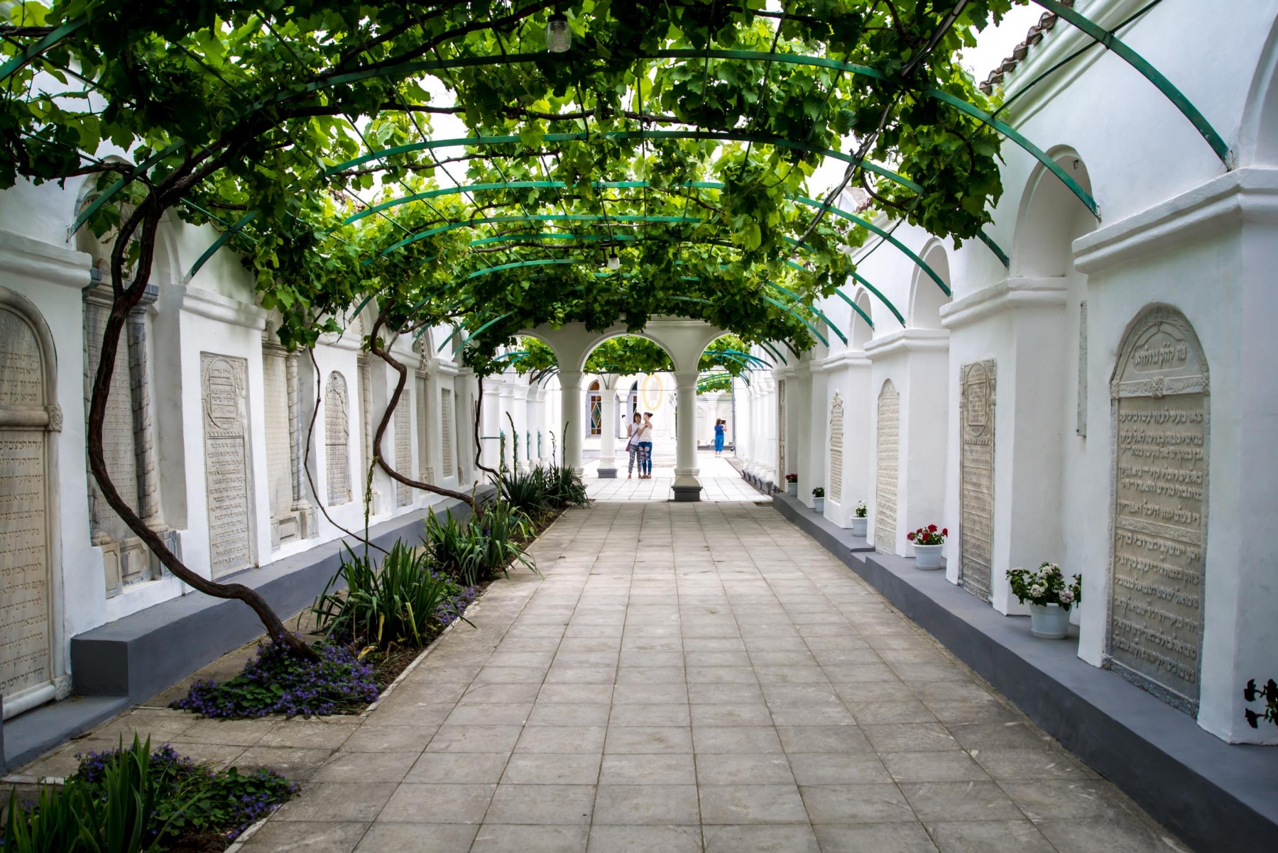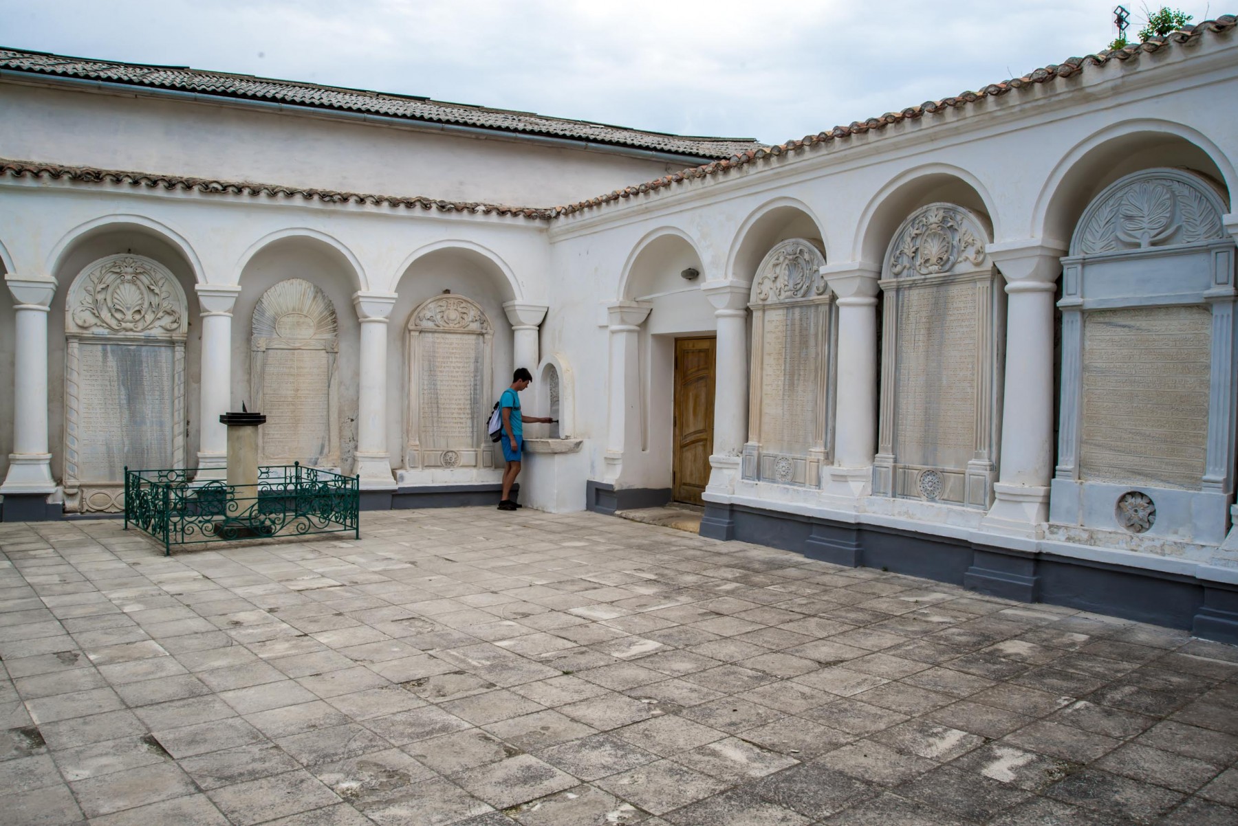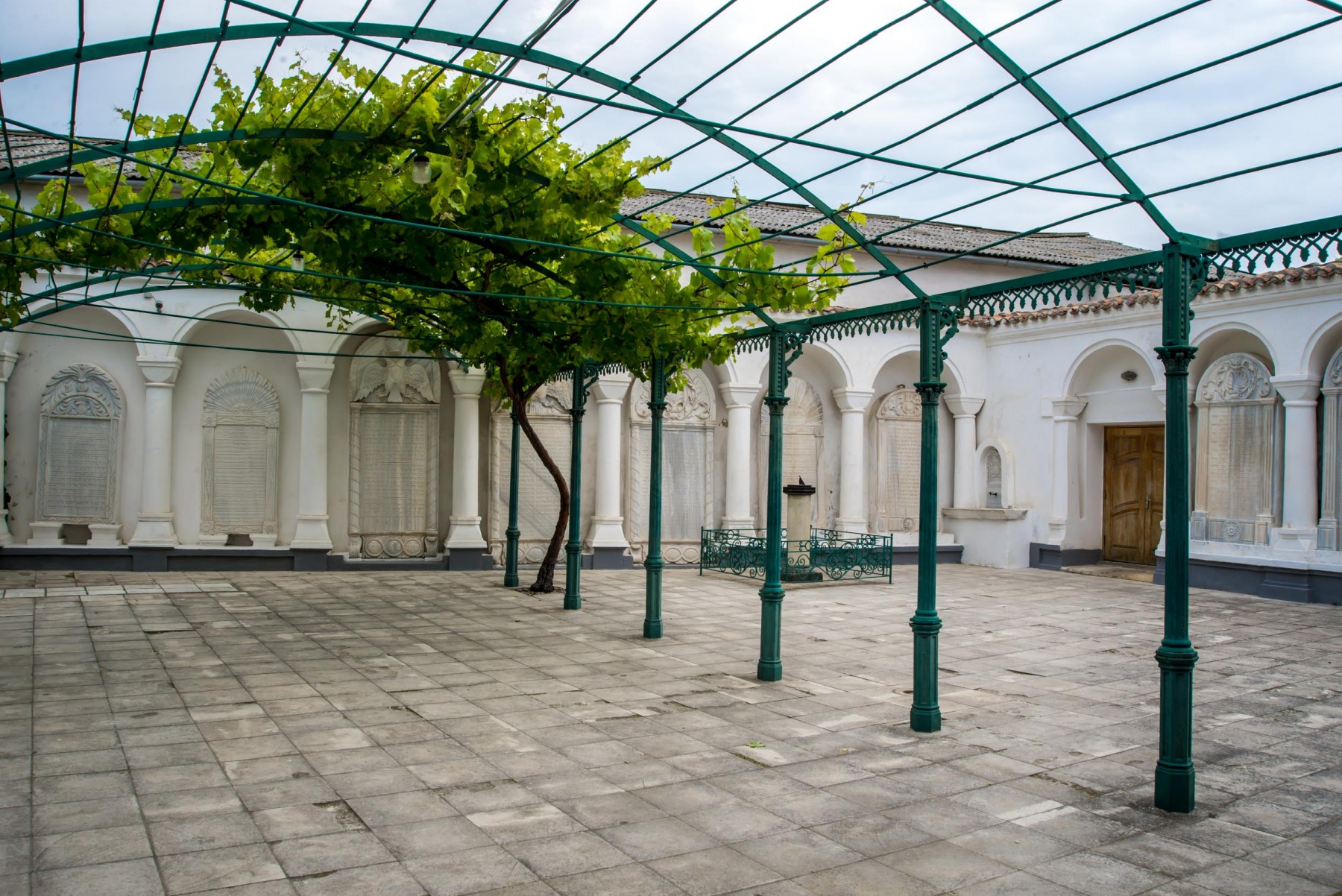 Именно сюда сперва попадает каждый турист и прихожанин кенас. Портал главного входа с большими ажурными металлическими воротами выполнен в 1889-1890 годах. Виноградный дворик – первый из трех, следующих один за другим, дворов. Задача двориков, по замыслу создателей комплекса, заключается в том, чтобы подготовить верующих к молитвенному настроению еще до вхождения в храм.Слева от входа вы можете увидеть маленький мраморный фонтанчик для омовения рук перед молитвой. В стенах дворика установлены мраморные плиты, которые на библейском языке рассказывают о важнейших событиях из жизни караимов. Самая древняя из плит датируется 1790 годом. В 1994 году во дворе была установлена мемориальная доска, посвященная караимам, погибшим во времена войн и террора.