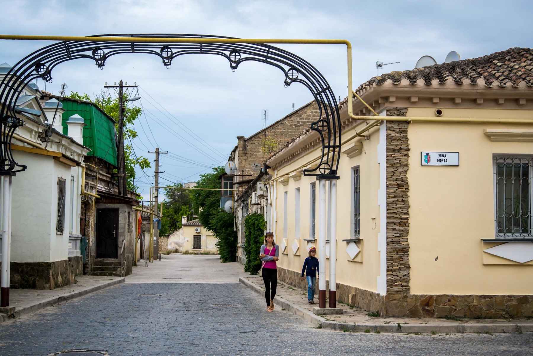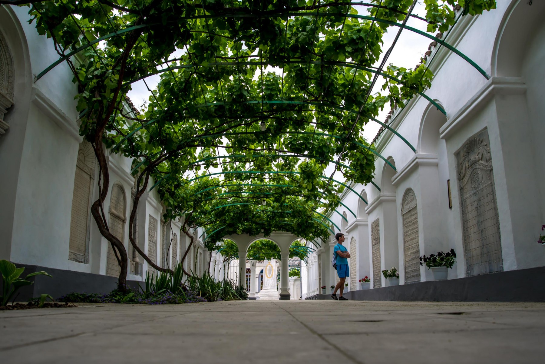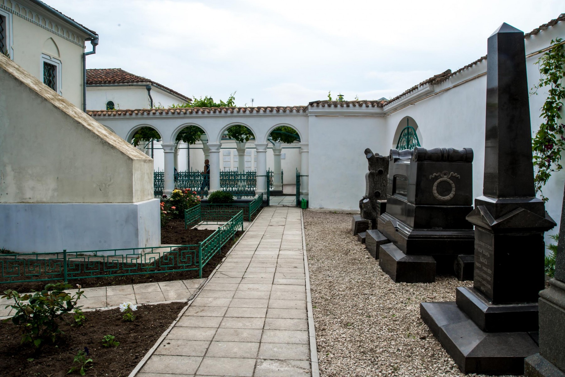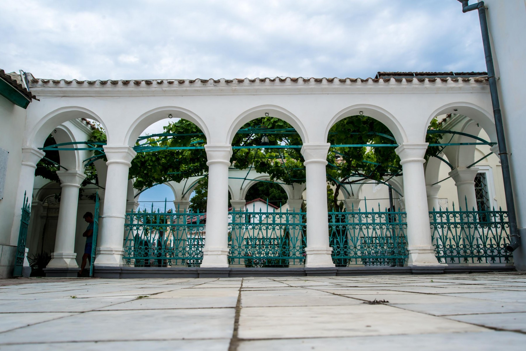 Именно сюда сперва попадает каждый турист и прихожанин кенас. Портал главного входа с большими ажурными металлическими воротами выполнен в 1889-1890 годах. Виноградный дворик – первый из трех, следующих один за другим, дворов. Задача двориков, по замыслу создателей комплекса, заключается в том, чтобы подготовить верующих к молитвенному настроению еще до вхождения в храм.Слева от входа вы можете увидеть маленький мраморный фонтанчик для омовения рук перед молитвой. В стенах дворика установлены мраморные плиты, которые на библейском языке рассказывают о важнейших событиях из жизни караимов. Самая древняя из плит датируется 1790 годом. В 1994 году во дворе была установлена мемориальная доска, посвященная караимам, погибшим во времена войн и террора.