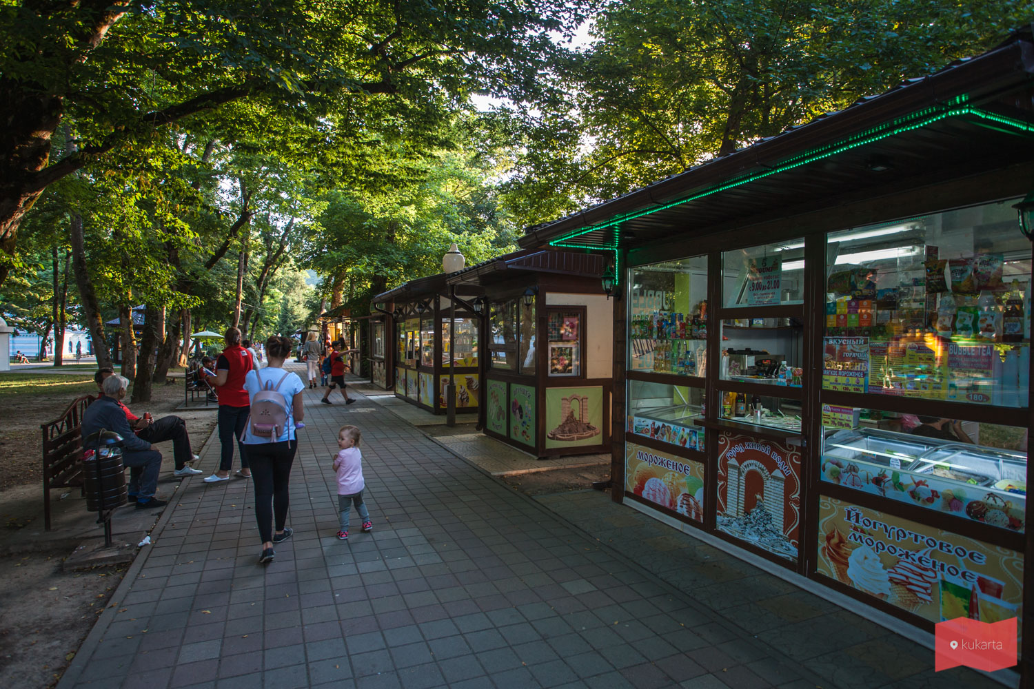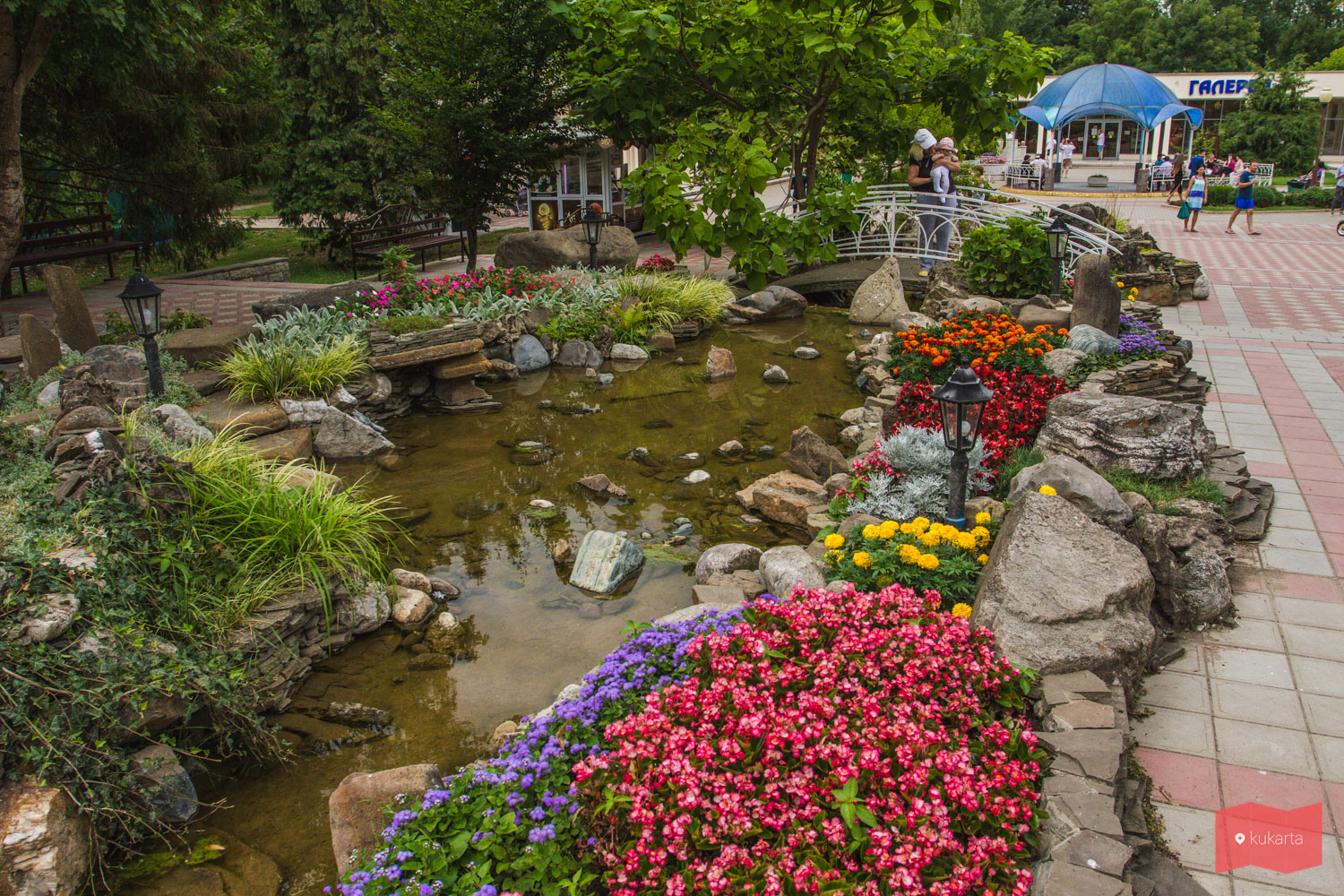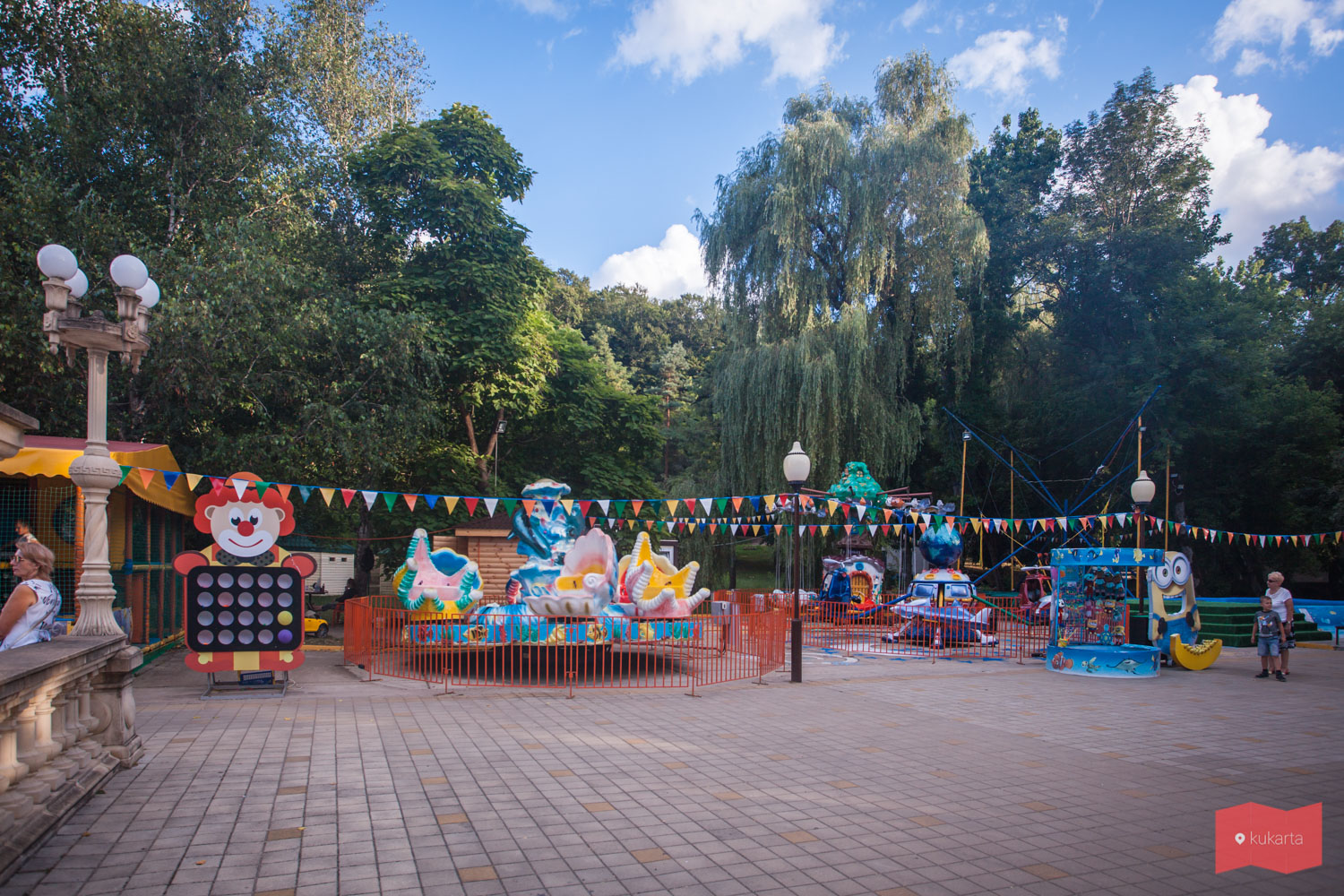Условно парк можно поделить на две части – в правой более спокойно, левая насыщена торговыми точками, сувенирными лавками, детскими развлечениями и в целом более людная.