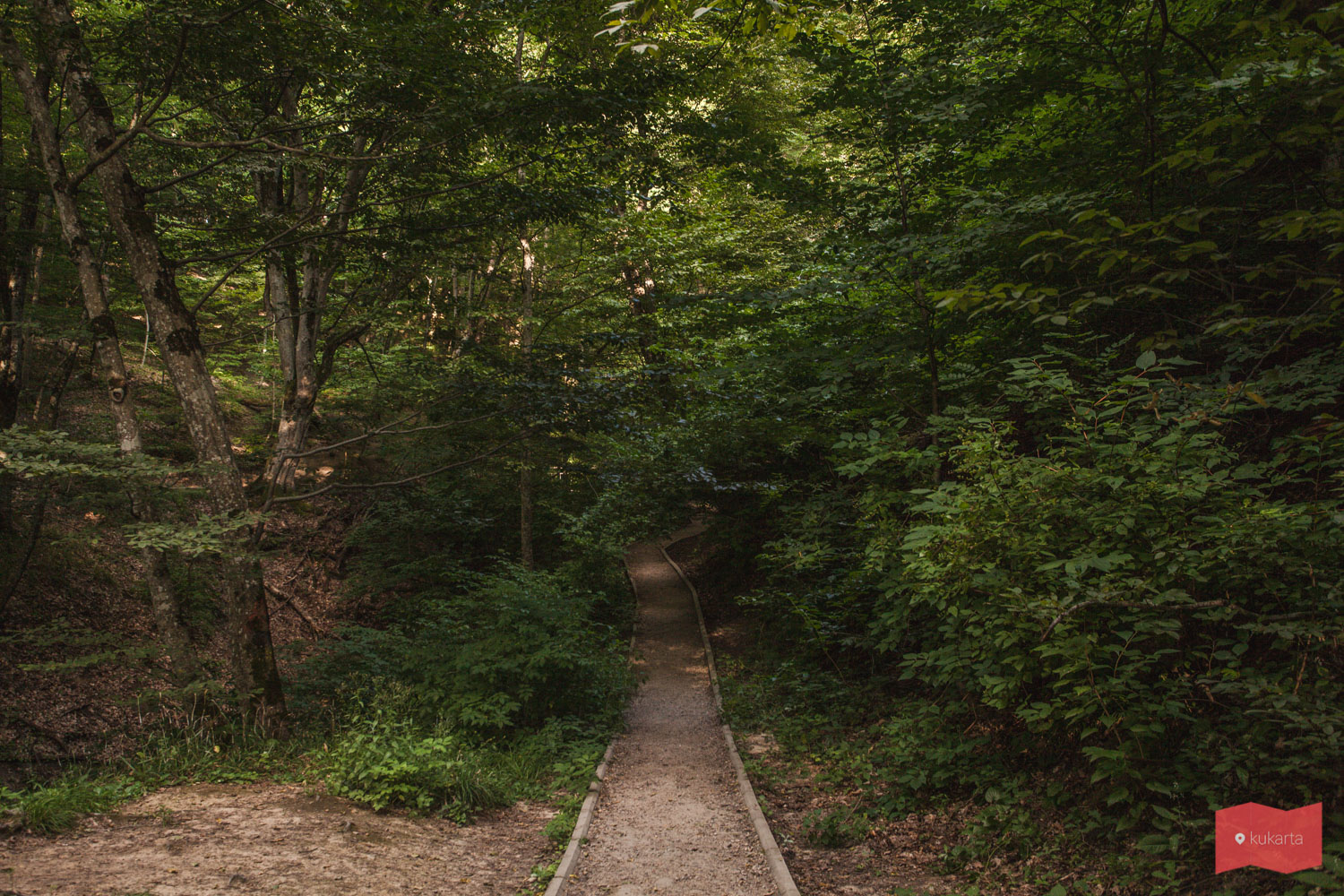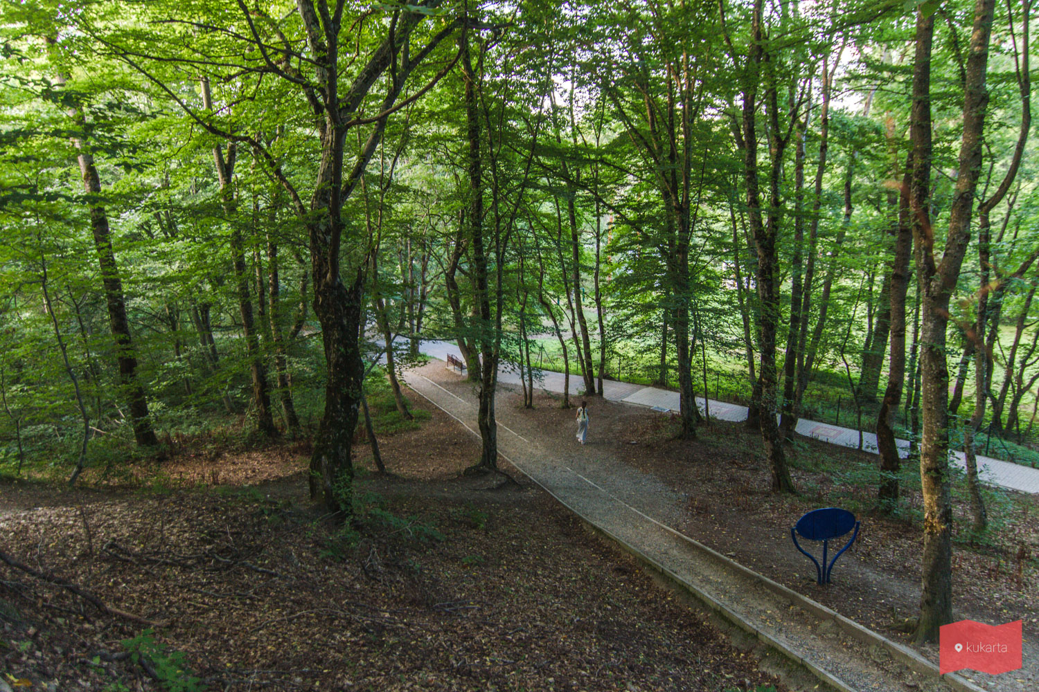 Эта часть парка постепенно уводит в гору, но при этом здесь можно почувствовать себя в настоящем лесу. Из минусов, стоит отметить, что местами отсутствуют дорожки. Бордюры есть, а дорожек нет. Также стоит учесть, если вы путешествуете с грудными детьми, то с коляской вам удастся дойти только до Дантово ущелья.