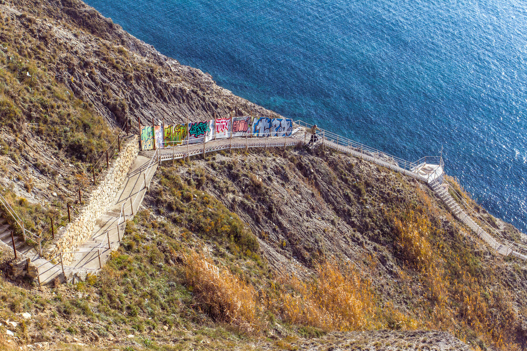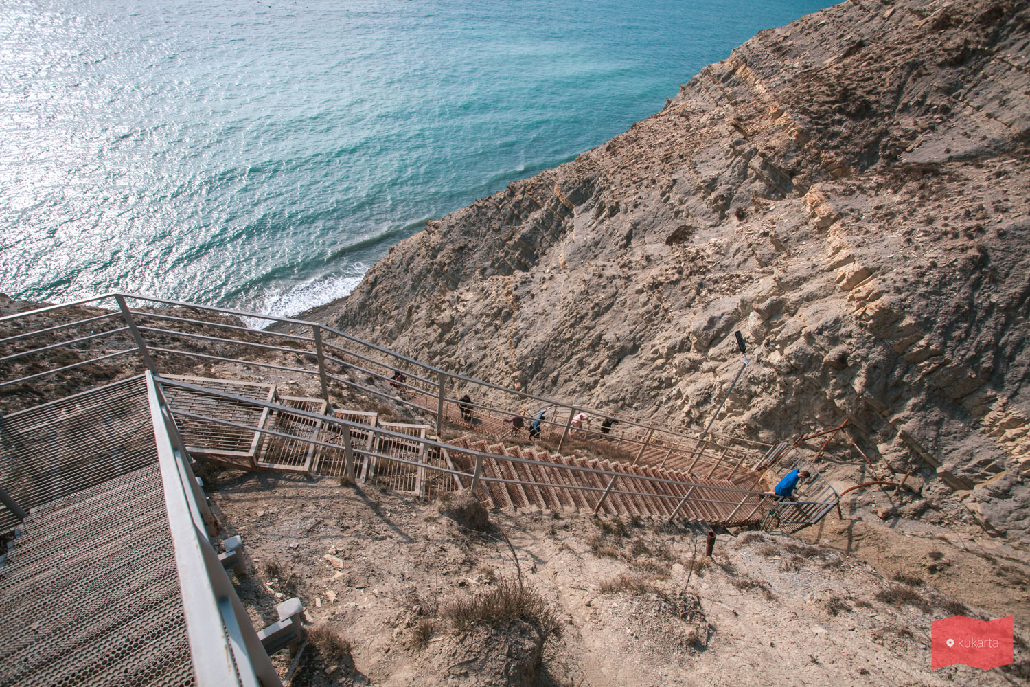 Сверху лестница смотрится масштабно и напоминает чем-то великую китайскую стену, которая тянется по холмам обрывистого пляжа. На пути встречаются смотровые площадки и скамьи для отдыха.