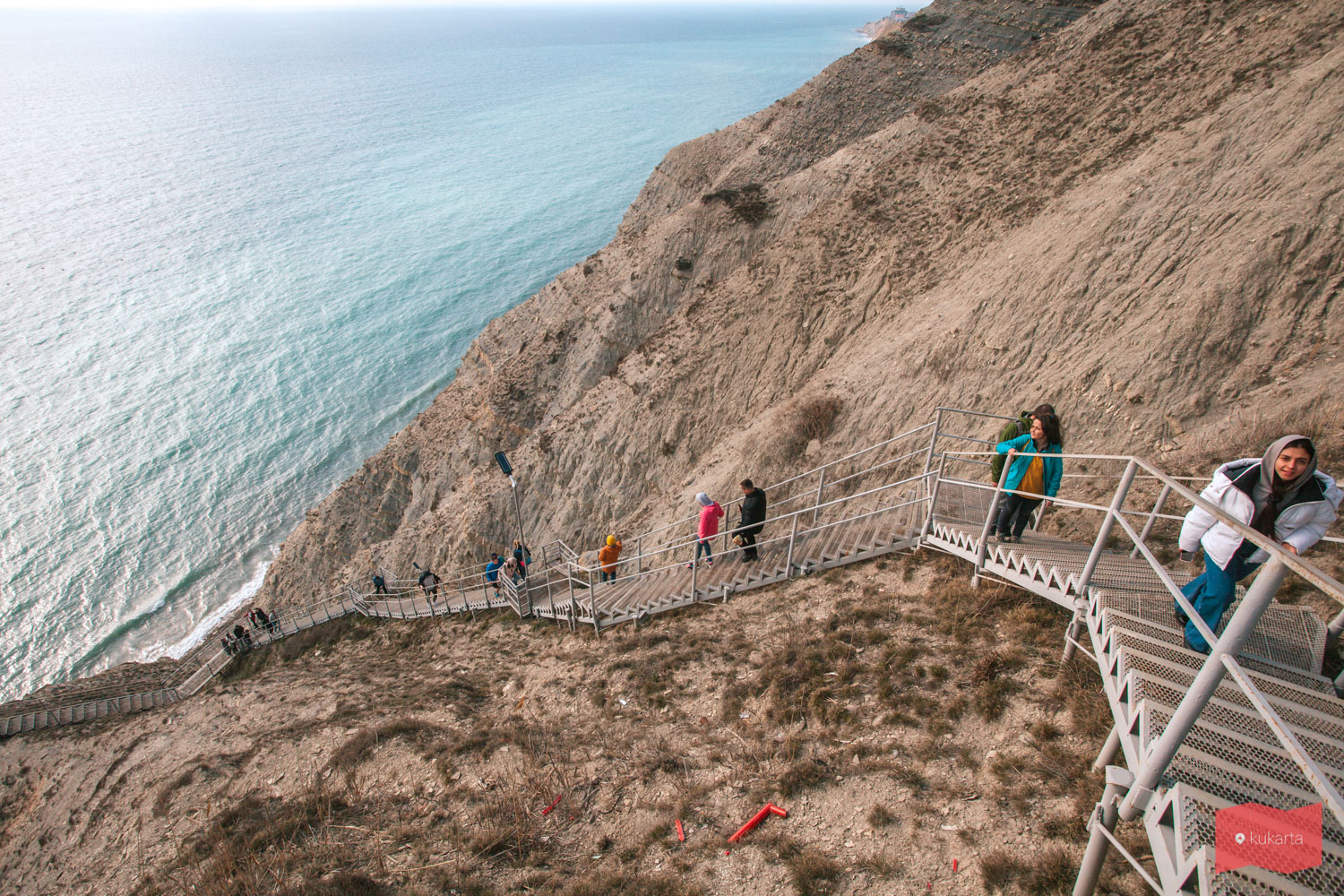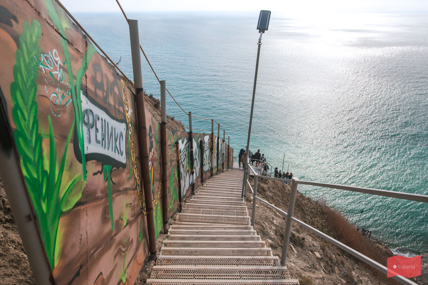 В поселке Супсех, что расположен рядом с Анапой, есть необычная лестница 800 ступеней, которая ведет на пляж. Так вышло, что поселок расположен на горе, которая резко обрывается в море. Под скалами есть узкая береговая полоса, но добраться к ней не так просто. Единственный путь проходит по этой лестнице.
