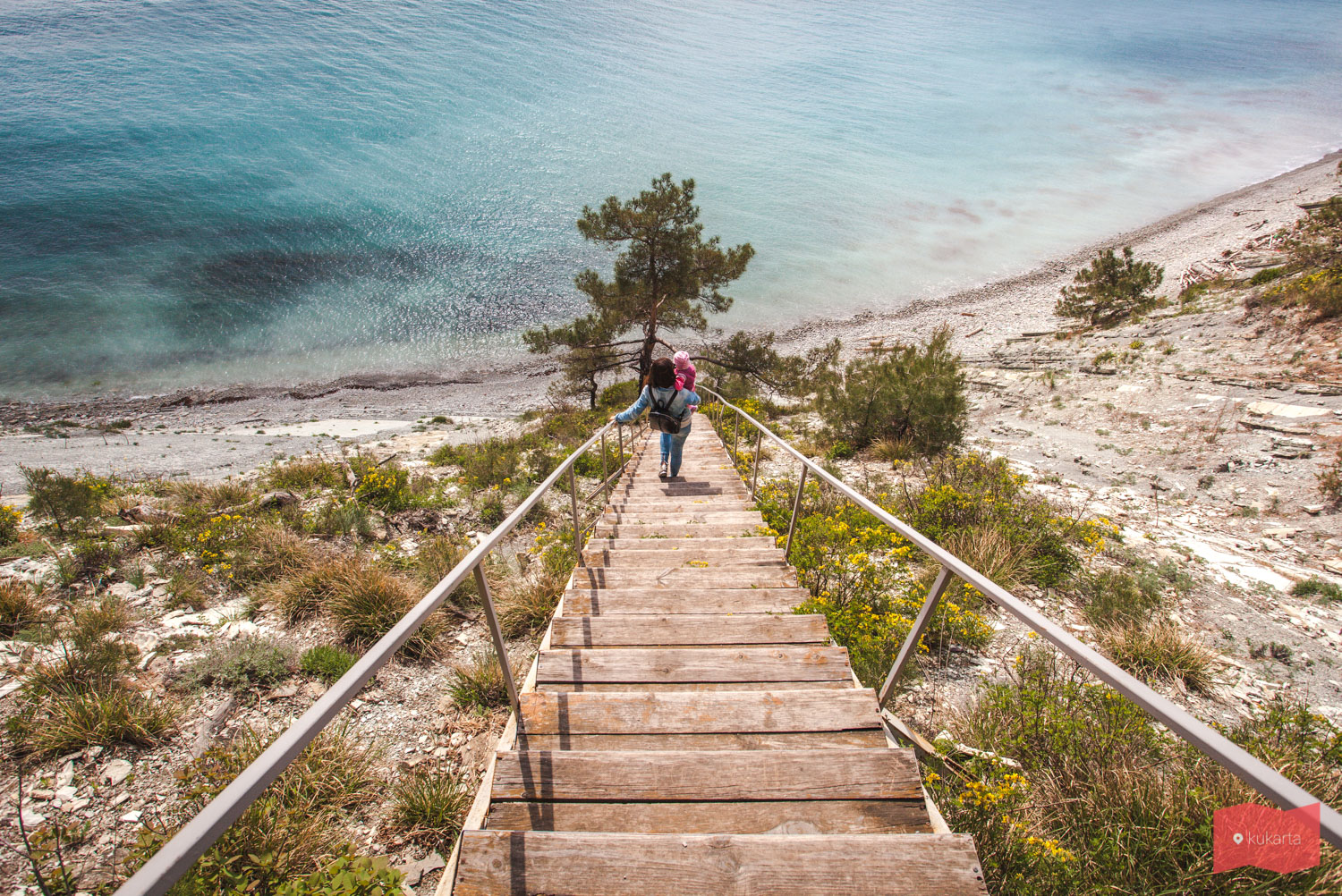 Помимо лестницы здесь есть дикий пляж и прекрасная тропа с живописными смотровыми площадками, самое красивое место находится здесь – 44.577824, 37.97031