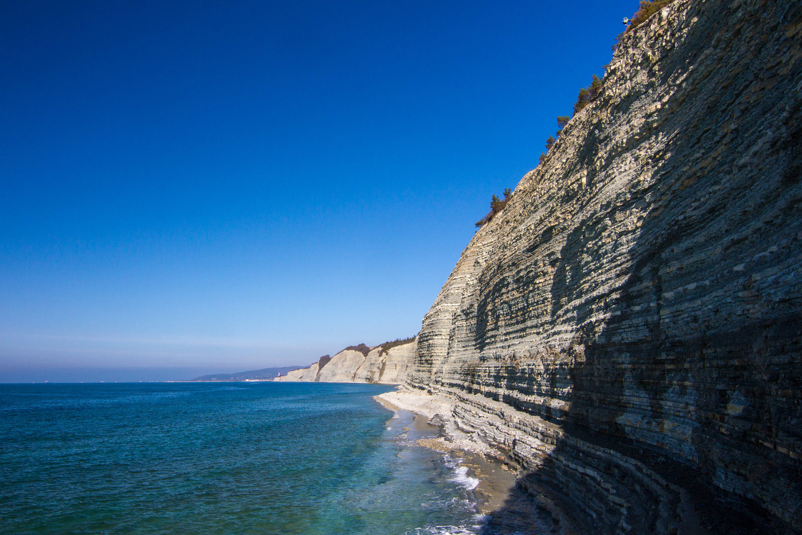 Красивый галечный пляж с узкой береговой полосой в обрамлении отвесных скал.