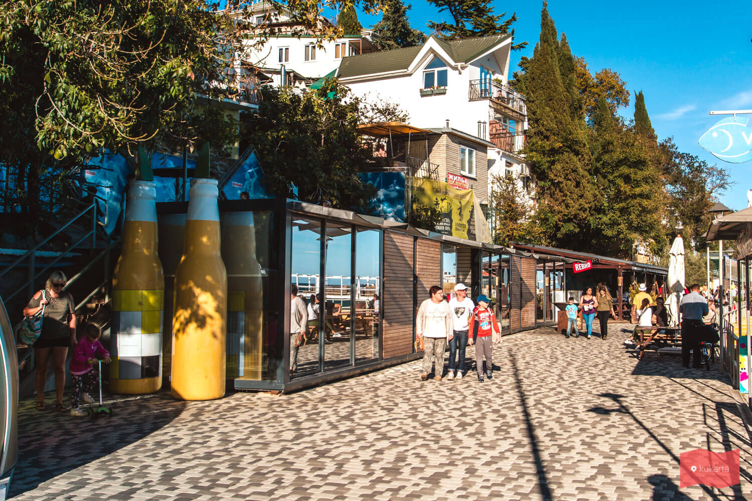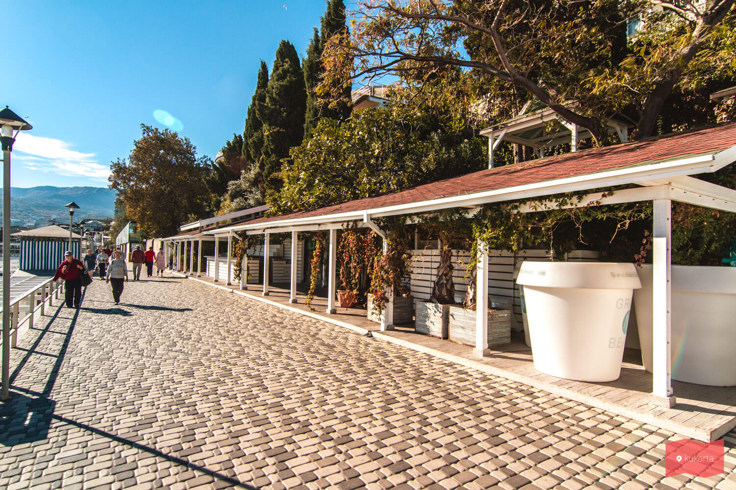 Все сектора оборудованы навесами, кабинками для переодевания, душем и бесплатными и чистыми туалетами, местами для курения и урнами. Каждая зона отдыха имеет свое стильное оформление, здесь не встретишь разномастных ларьков — только приятные однотипные магазинчики. Территорию украшают многочисленные растения в горшках. В разных зонах можно арендовать бунгало, шезлонг, либо комплекс для отдыха, включающий зонты и столы. На территории открыты кафе и рестораны, есть бассейны и спортивные тренажеры, установлены столы для настольного тенниса, работают детские аттракционы и тир. Вечерами на пляже проходят концерты, нередко приглашают звезд.