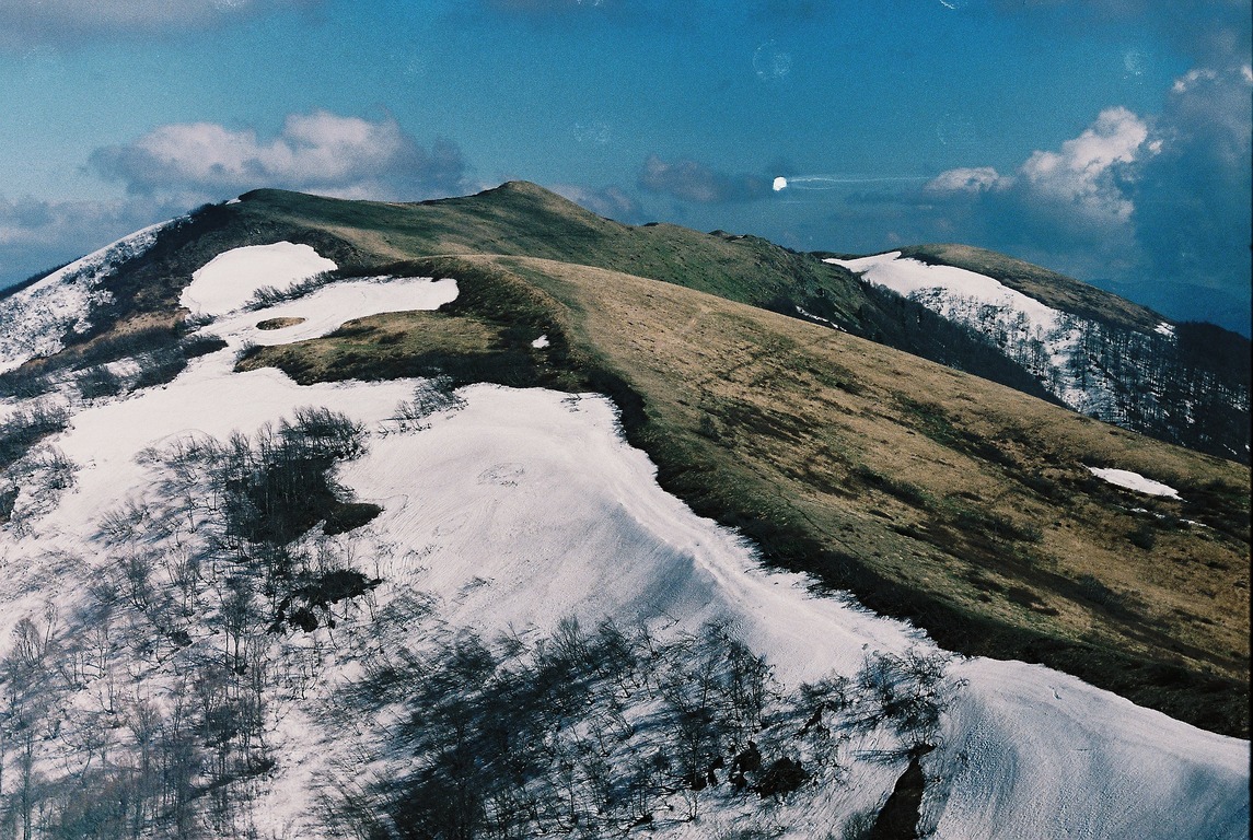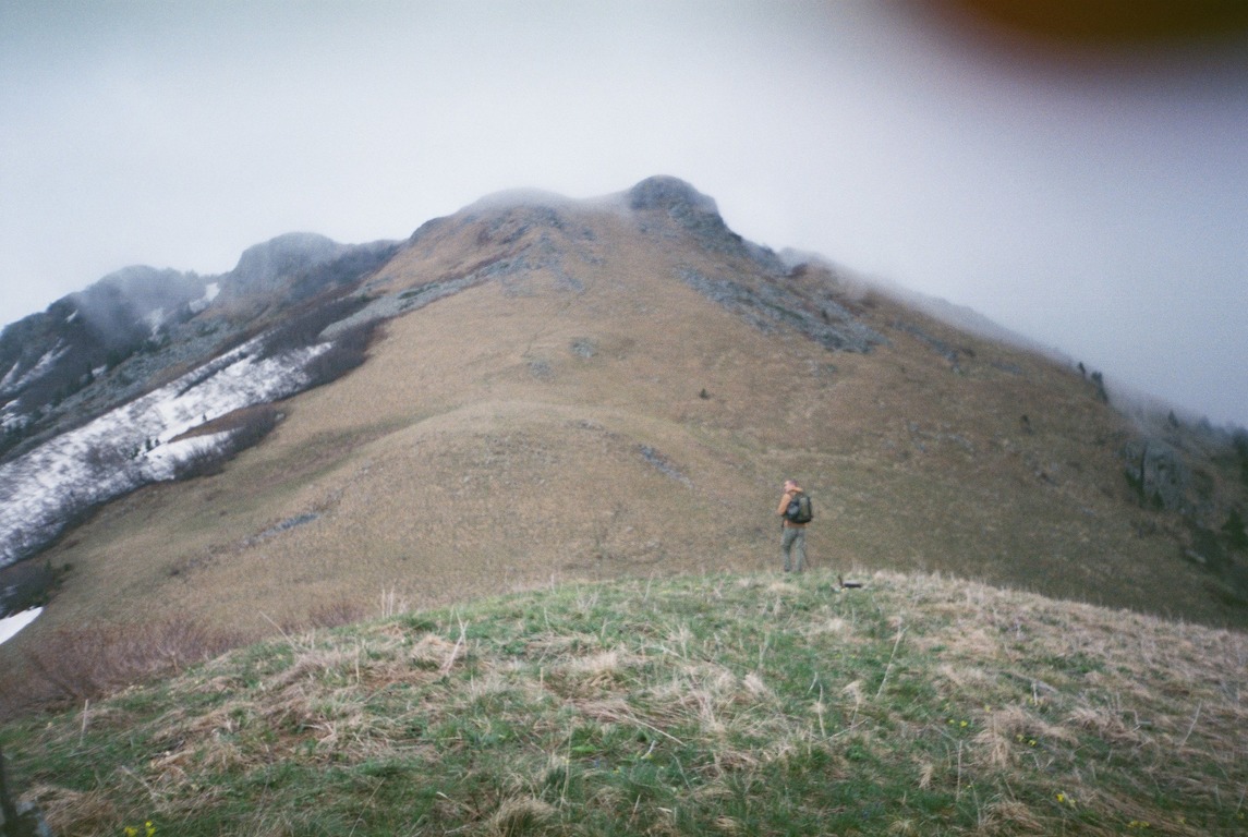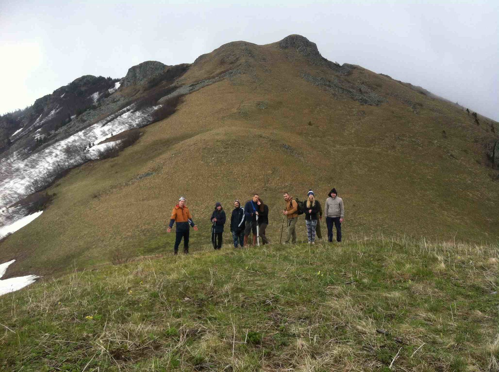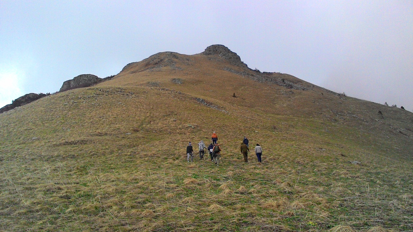 Взбираясь на хребет с северной стороны нас ждало: обилие снега, редкие деревца, очень крутой подъём вверх, и около 20 метров, хило стоящих друг на друге камня, по которым предстояло взбираться Рисковали, несомненно. Градус подъёма увеличивался. Сначала ползли, а потом в прямом смысле карабкались, цепляясь за кусты и мелкие деревца. Ближе к вершине, снег отступал, и появлялись скальные камни, которые годами лежат, как попало друг на друге, и спокойно так себе выветриваются. Не знаю, что было страшнее: медведь или подъём на стену? Но мы справились.