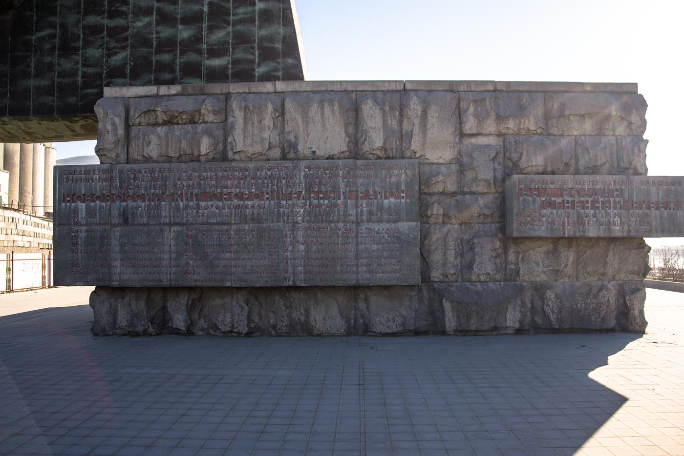 На отдельном постаменте мемориального комплекса размещены памятные доски. Здесь можно увидеть барельеф солдат и слова из обращения Военного Совета к войскам: «Красноармейцы, краснофлотцы, командиры и политработники. Станьте скалой на пути врага».