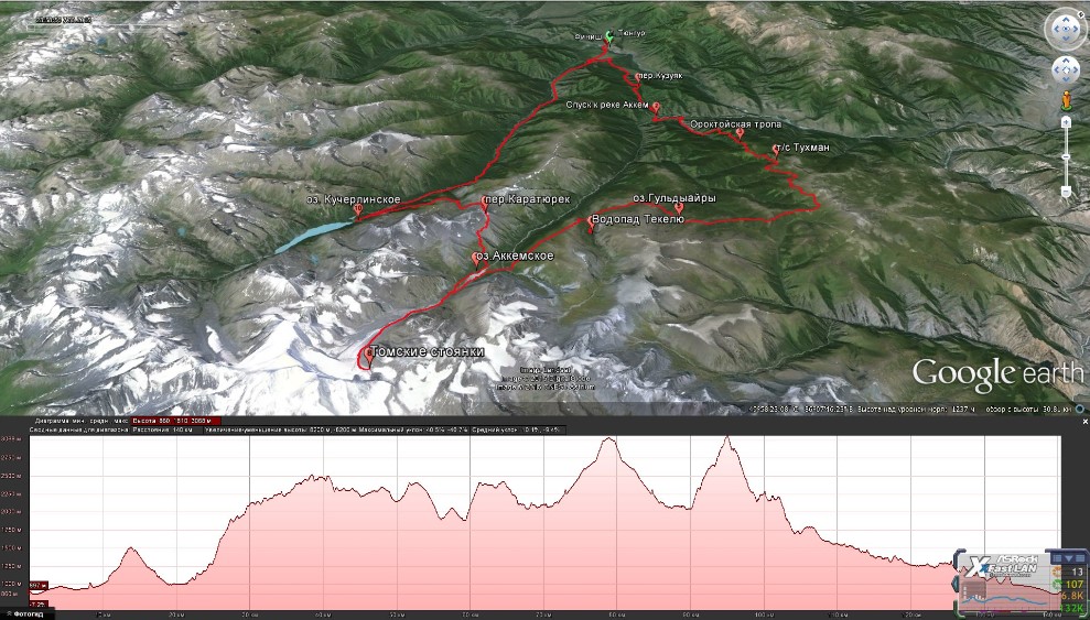 Тюнгур – пер. Кузуяк – руч. Ороктой – руч.Тухман – водопад Текелю – Аккемское озеро – Томские стоянки (радиально)- перевал Каратюрек – Кучерлинское озеро – Тюнгур.