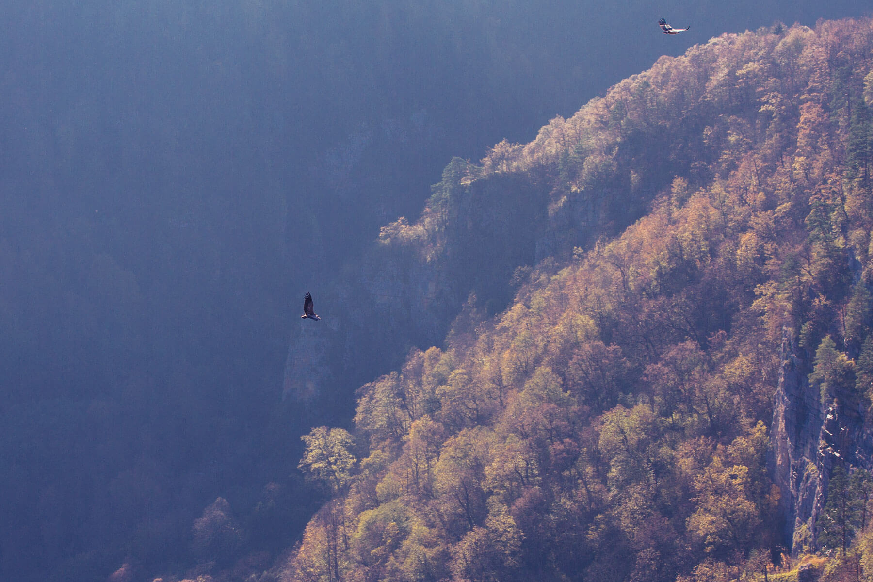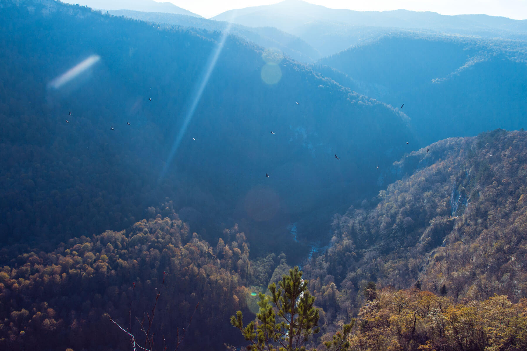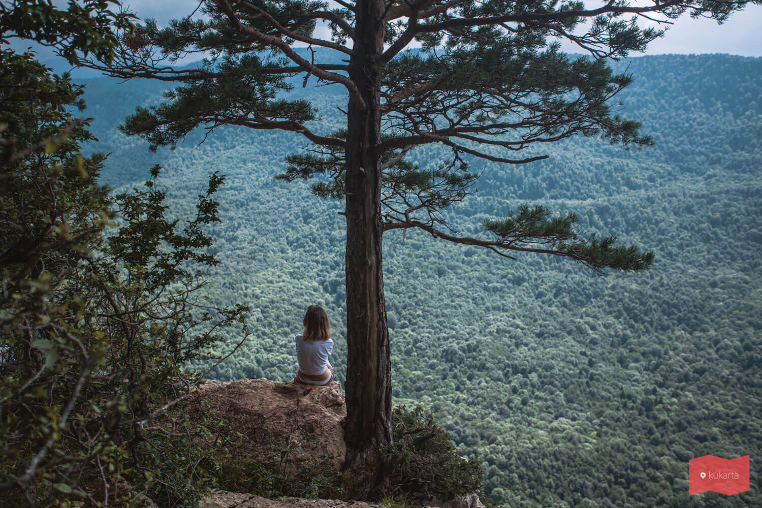 Далее вас ожидает путь к смотровой площадке «Пирамида», открывающийся вид восхищает. В момент нашего посещения стояла дымка и прозрачность воздуха была низкой. Тем не менее, отсюда мы увидели взмывающих к небо орлов, невероятное зрелище. Тут же удобно устроить привал, покушать, т.к. это практически середина маршрута, если идти по нашему треку.