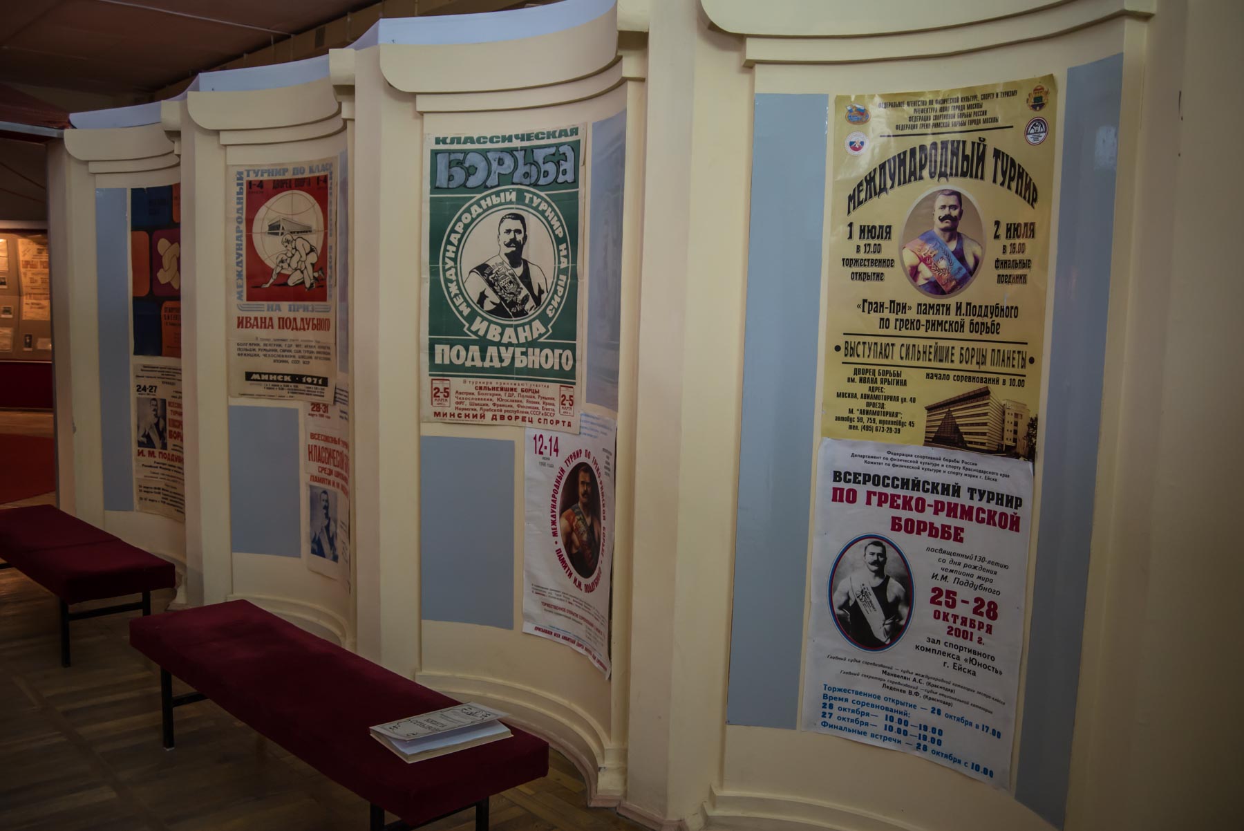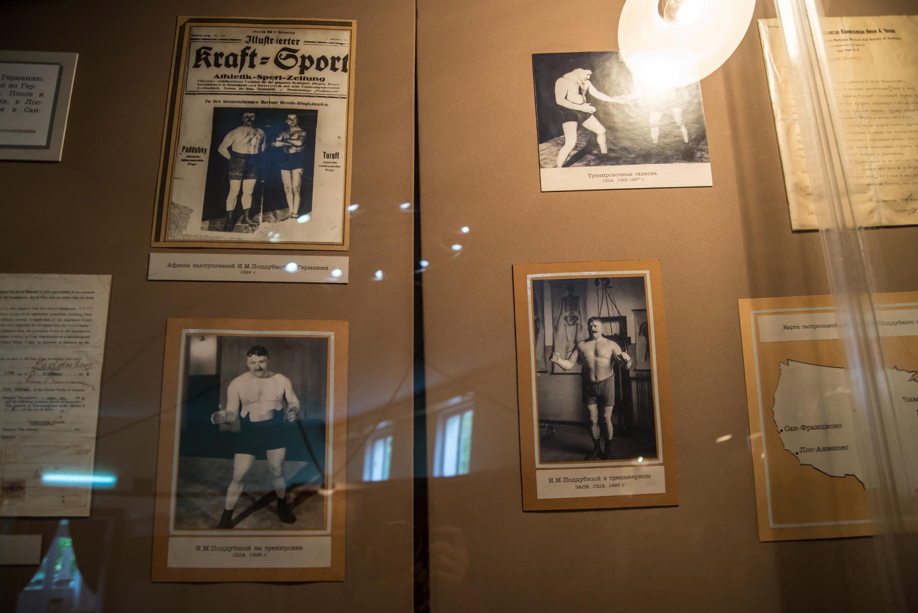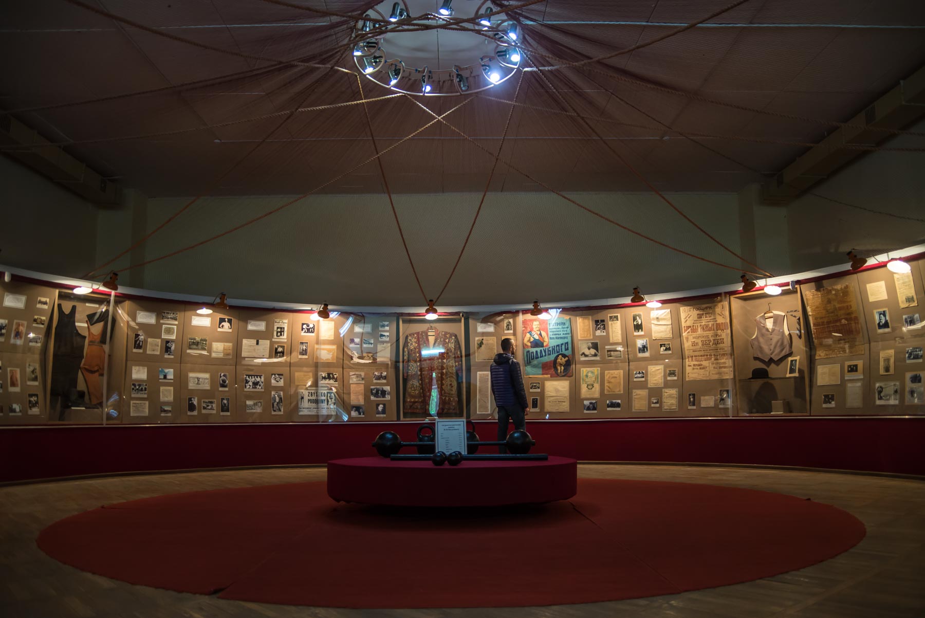 Дальше посетитель знакомится с “послужным списком” спортсмена, с теми противниками, которых за свою карьеру поборол Иван Максимович. Под стеклом витрин можно увидеть форму, в которой выступал атлет, его награды. Центральное место на “ковре” цирка-музея занимает стен с гантелями и гирями, которые использовал Поддубный. Их можно поднять и представить, как выглядели тренировки атлета.