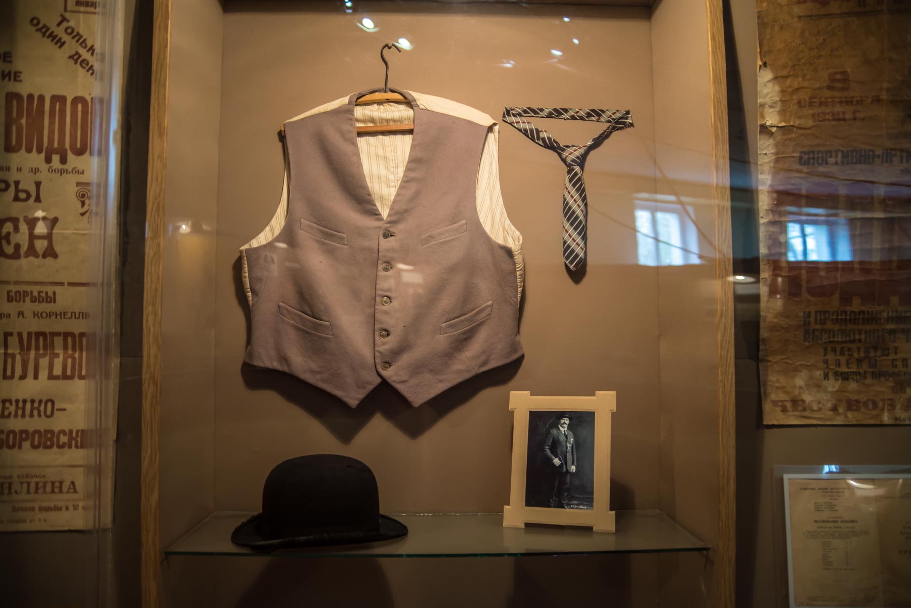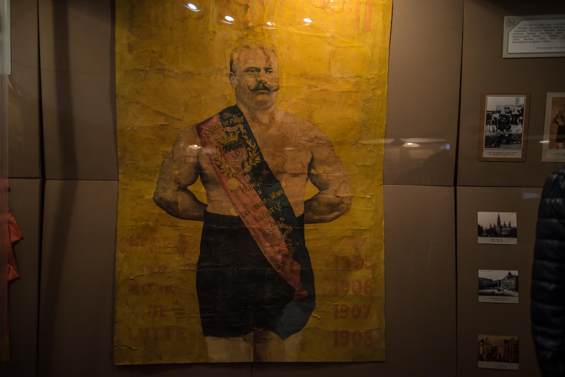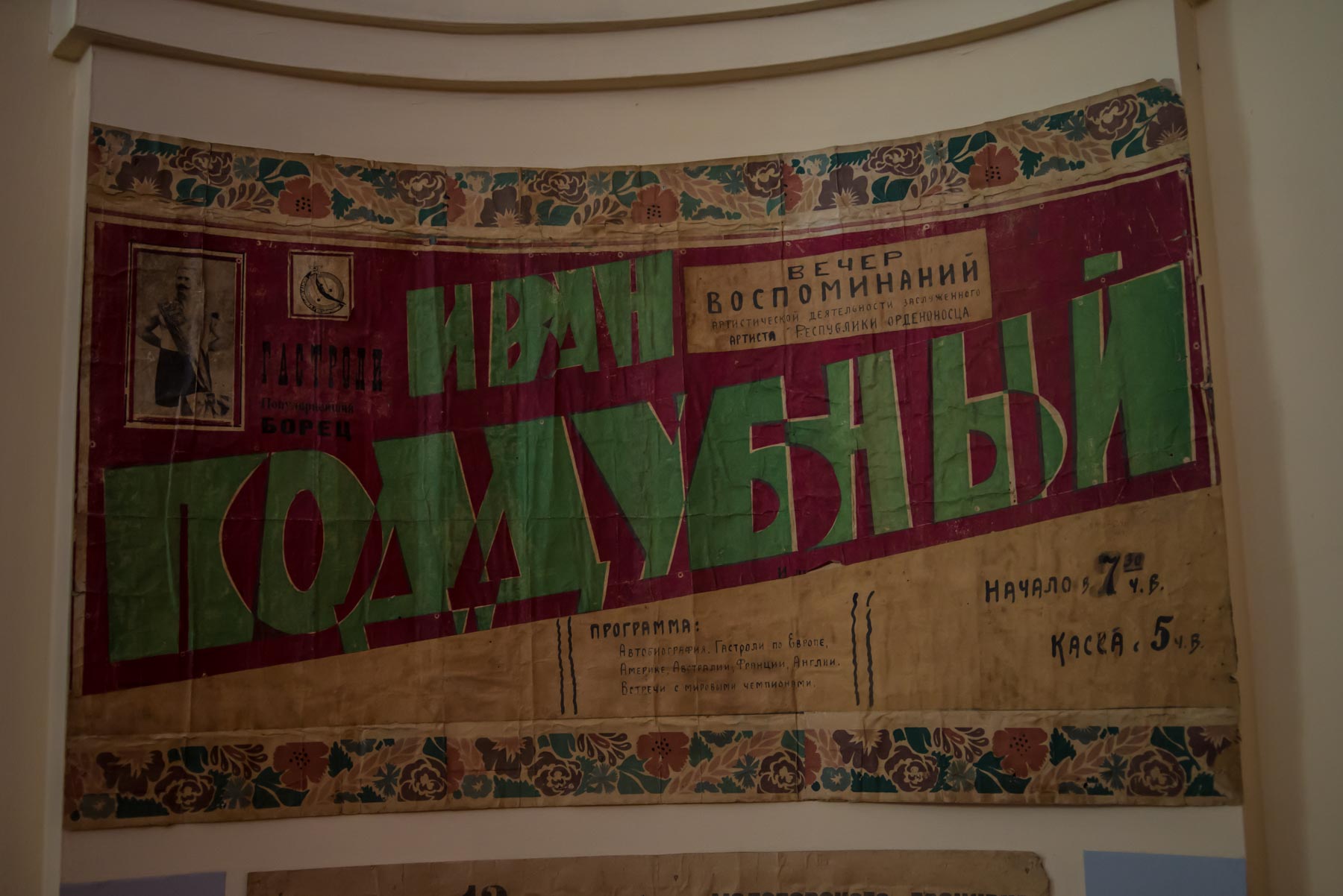 Дальше посетитель знакомится с “послужным списком” спортсмена, с теми противниками, которых за свою карьеру поборол Иван Максимович. Под стеклом витрин можно увидеть форму, в которой выступал атлет, его награды. Центральное место на “ковре” цирка-музея занимает стен с гантелями и гирями, которые использовал Поддубный. Их можно поднять и представить, как выглядели тренировки атлета.