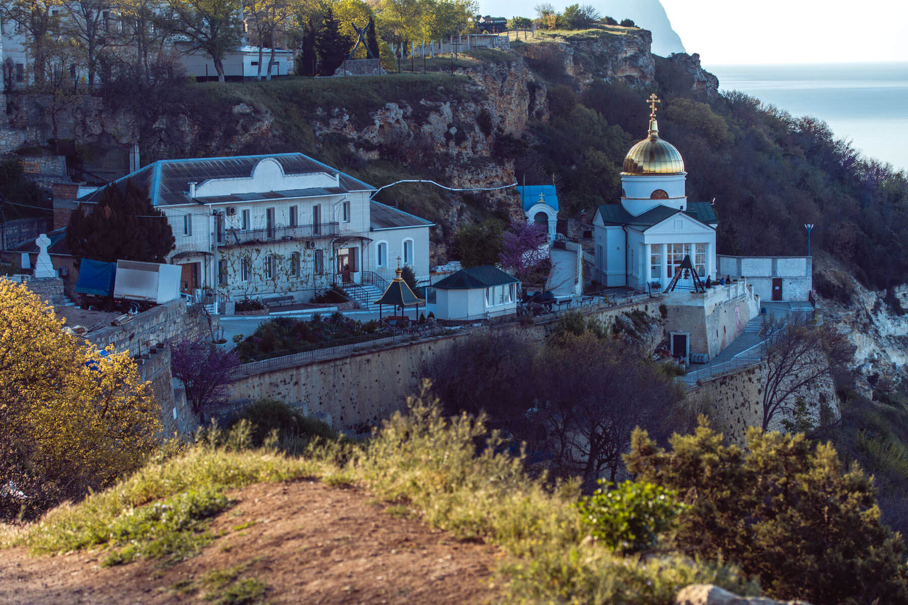 Прямо над пляжной полосой, над 150 м скальным обрывом разместилась одна из главных местных достопримечательностей – Балаклавская Свято-Георгиевская обитель. Мужской монастырь появился на побережье в 891 году. Его основали греки-мореплаватели, которых возле мыса застигла буря. В начале XIX веке монастырь называли «флотским», так как в нем размещалось духовенство, окормлявшее корабли российского флота в Черном море.