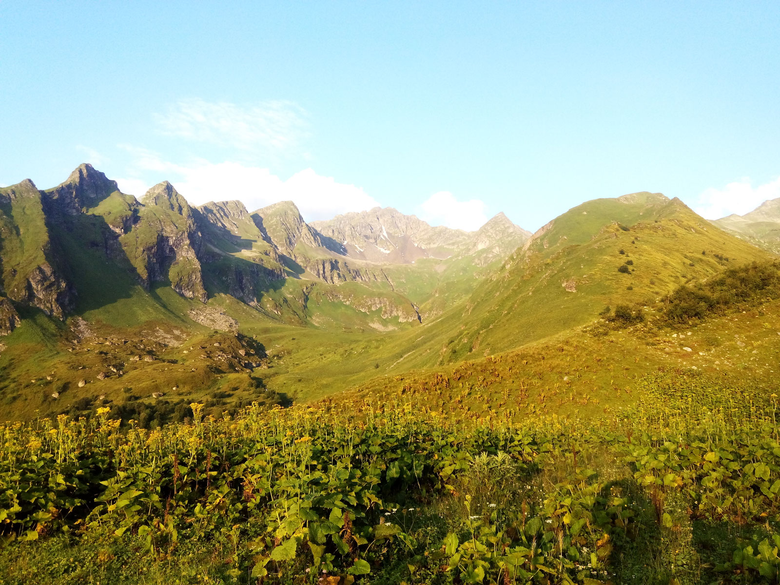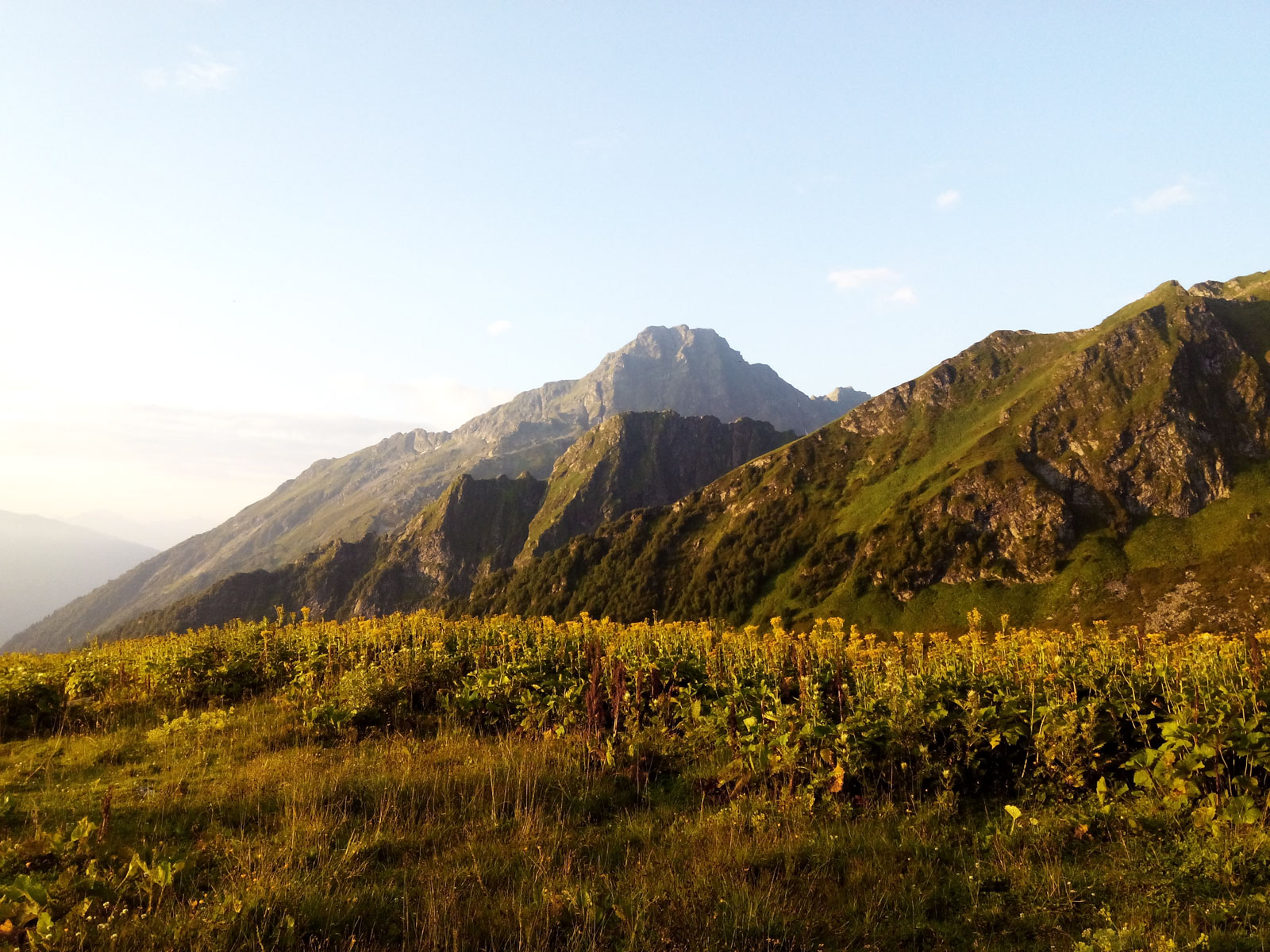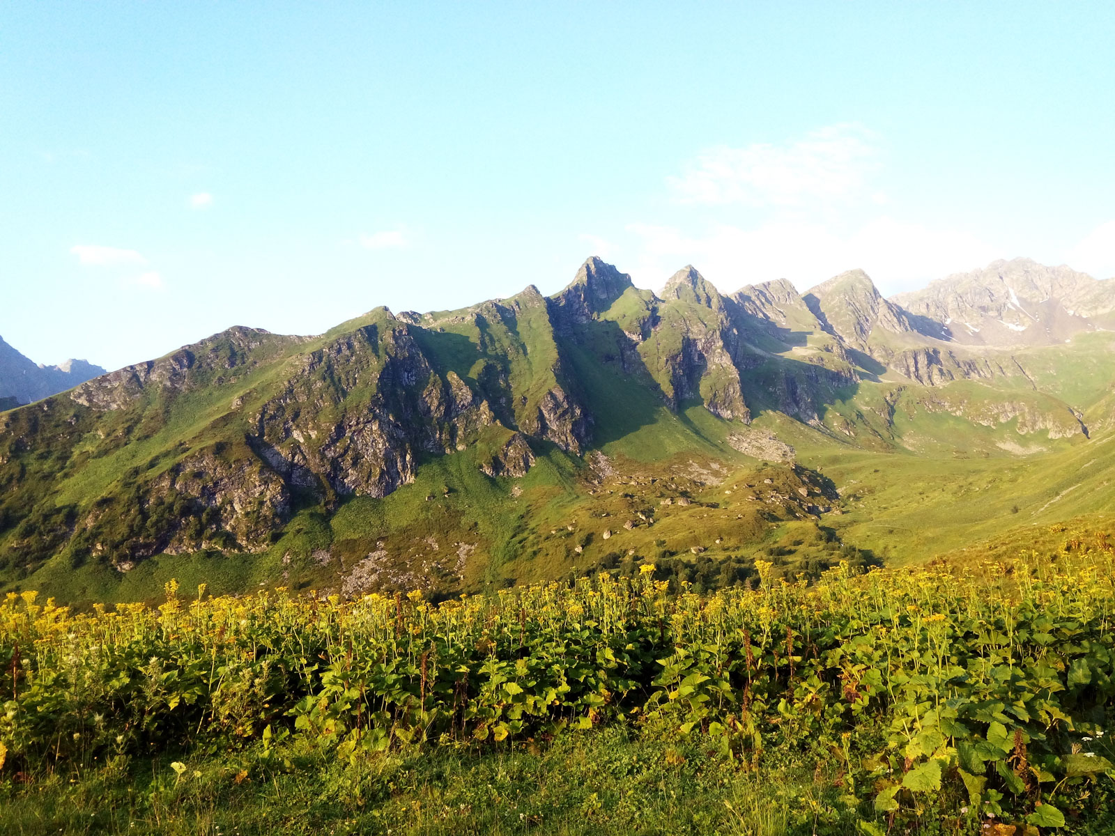 Встав около 5.40, нашему взору предстало великолепное зрелище. Величественные скальные хребты, альпийские луга, быстрые ручьи. Всё это заряжалось ярким солнечным светом, который заливал всю долину.