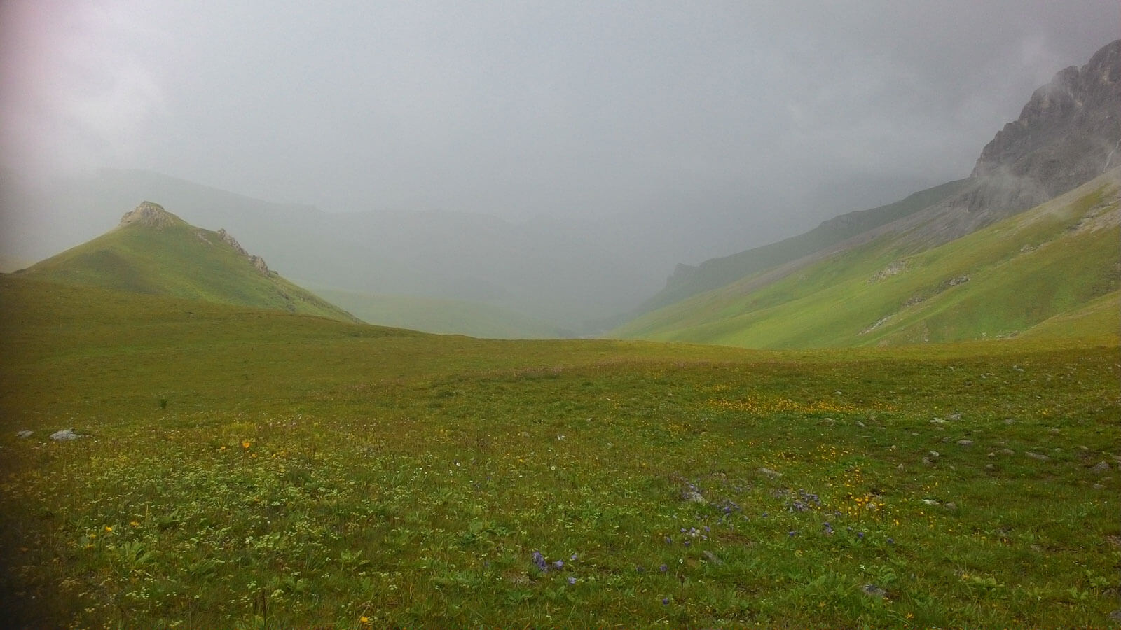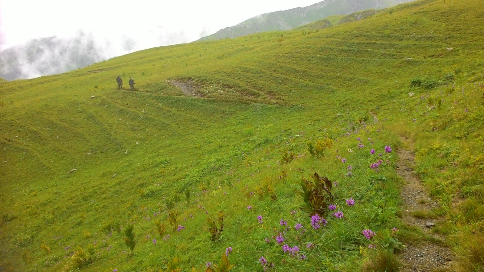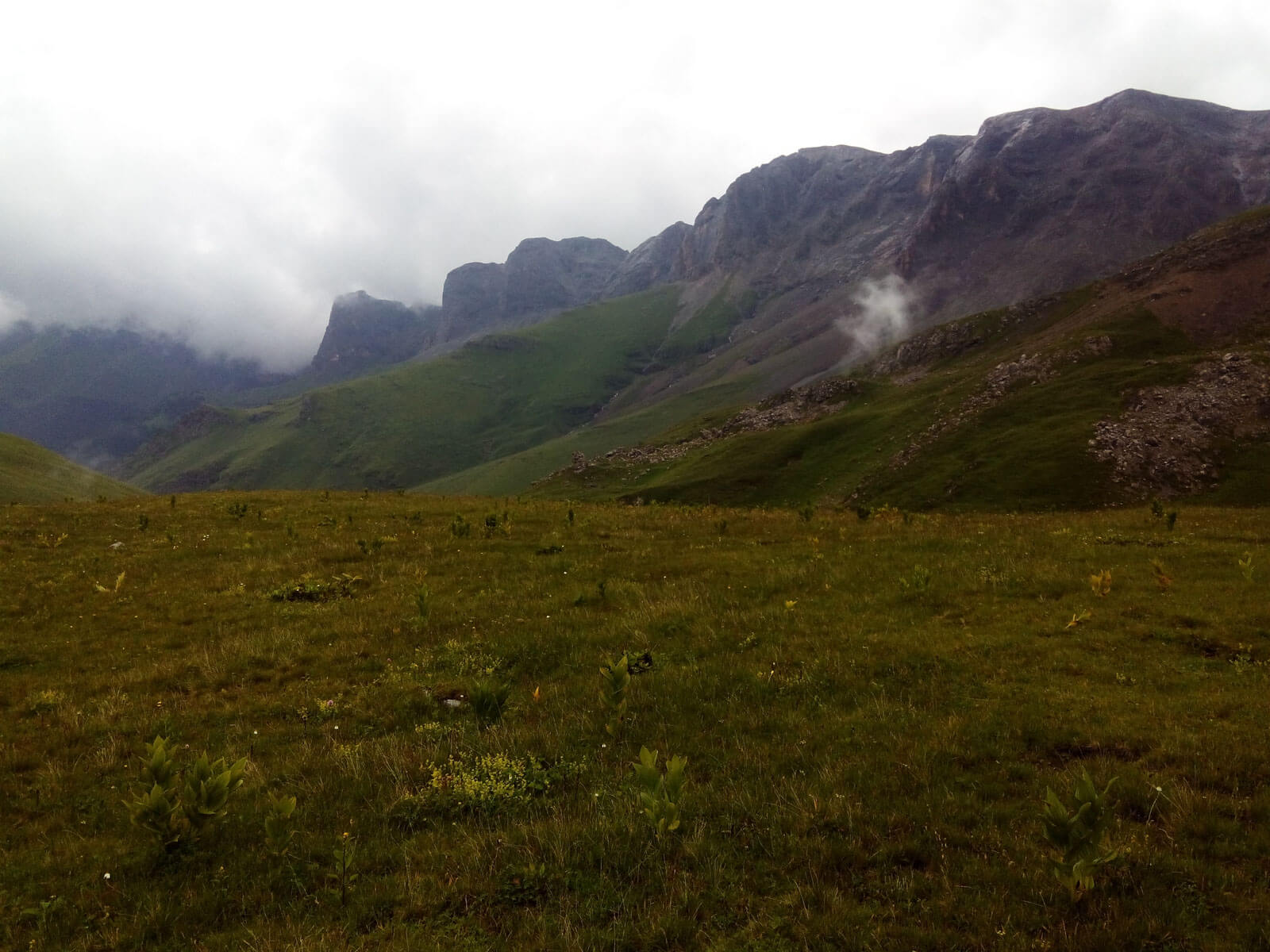 Справа и слева отвесные скалистые стены хребтов, вели нас словно по коридору. С них скатывались водопады, луга насыщались влагой, в травах бежали, скрываясь, ручейки… Мы же, повторяя за упомянутыми лугами, тоже насыщались влагой, от уже ставшего, чем-то родным и близким, дождя…