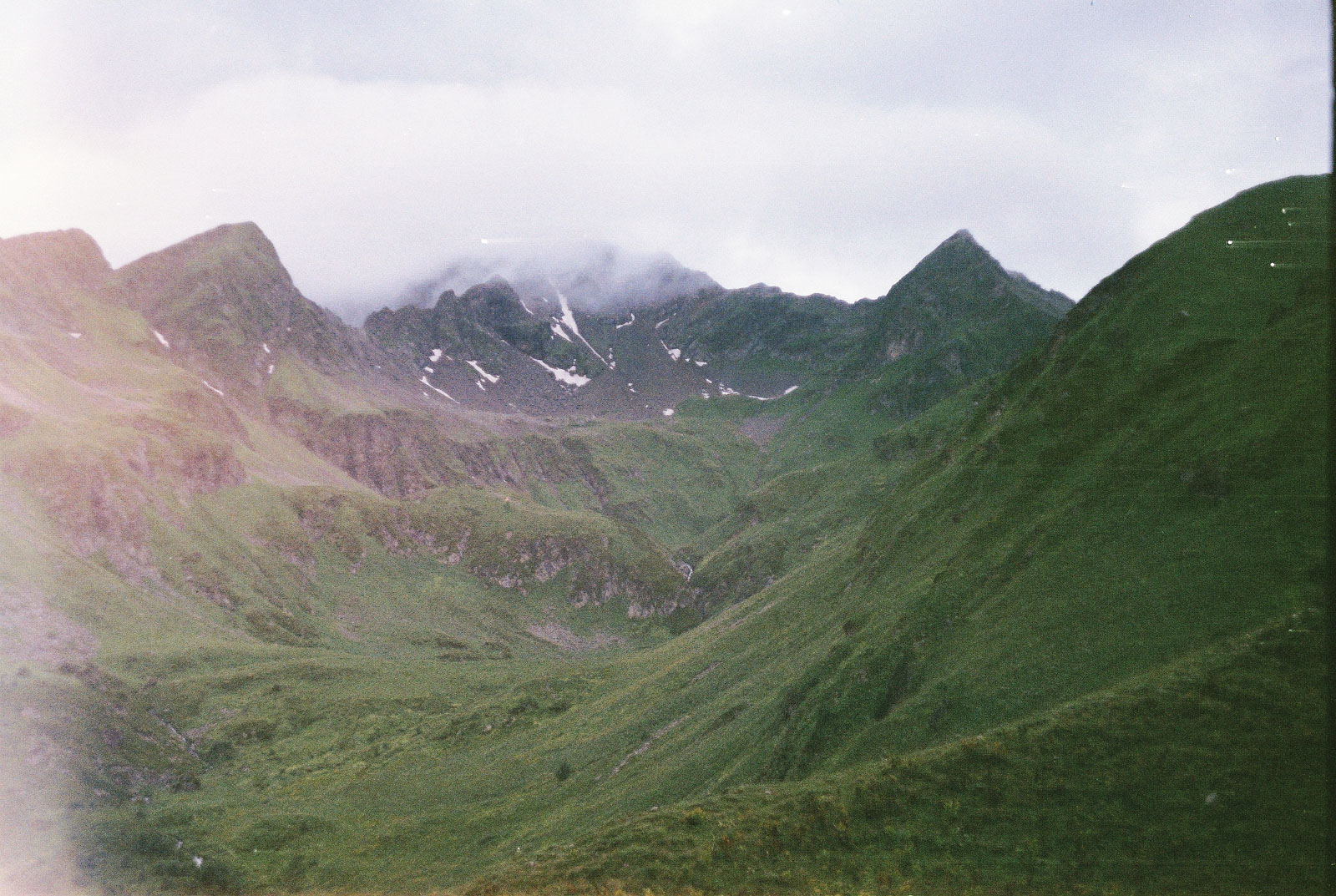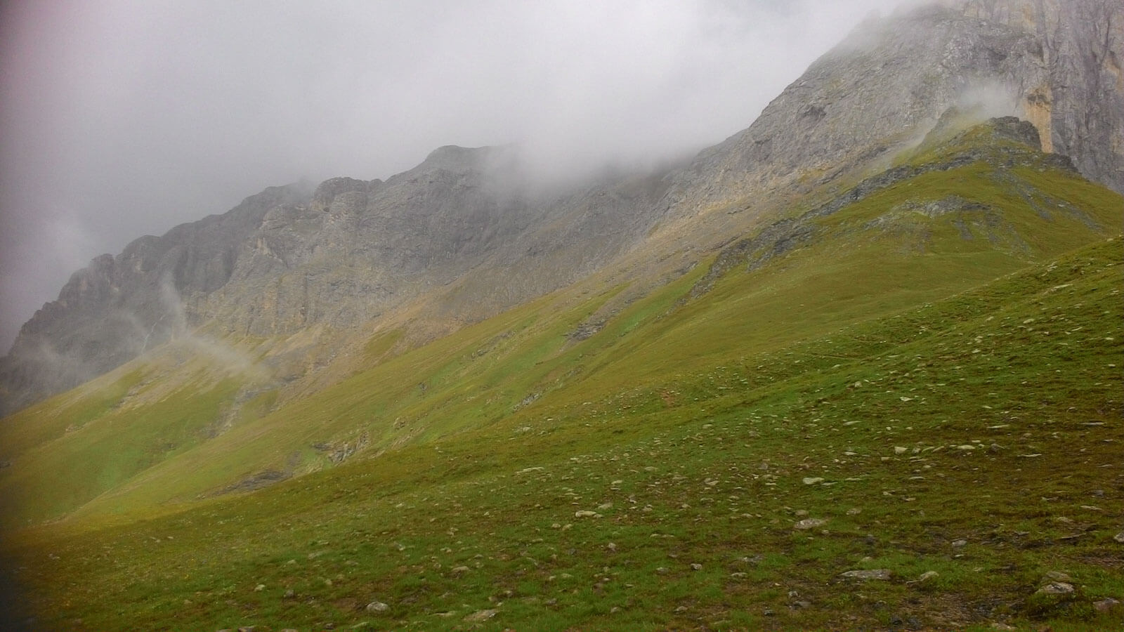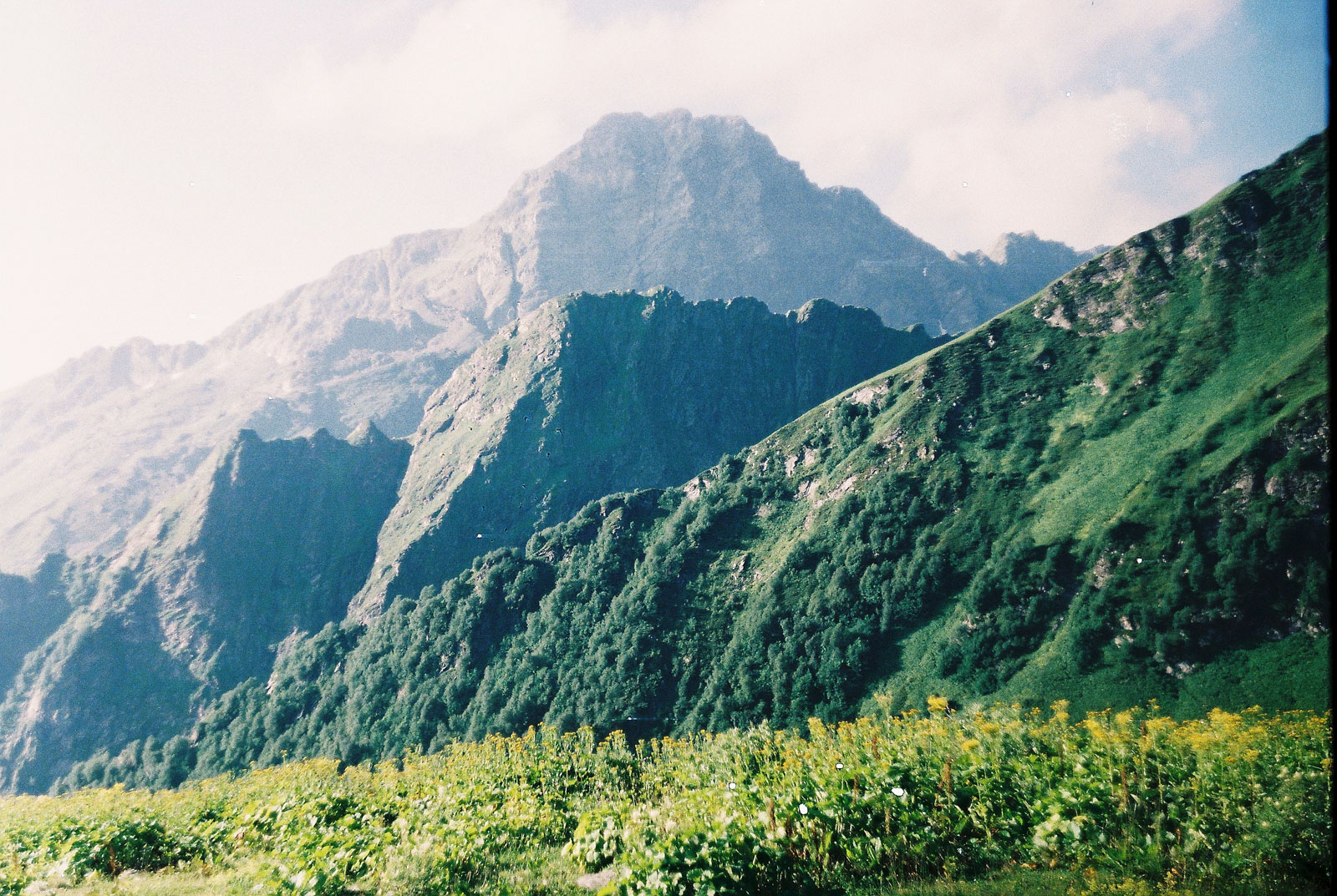 Справа и слева отвесные скалистые стены хребтов, вели нас словно по коридору. С них скатывались водопады, луга насыщались влагой, в травах бежали, скрываясь, ручейки… Мы же, повторяя за упомянутыми лугами, тоже насыщались влагой, от уже ставшего, чем-то родным и близким, дождя…