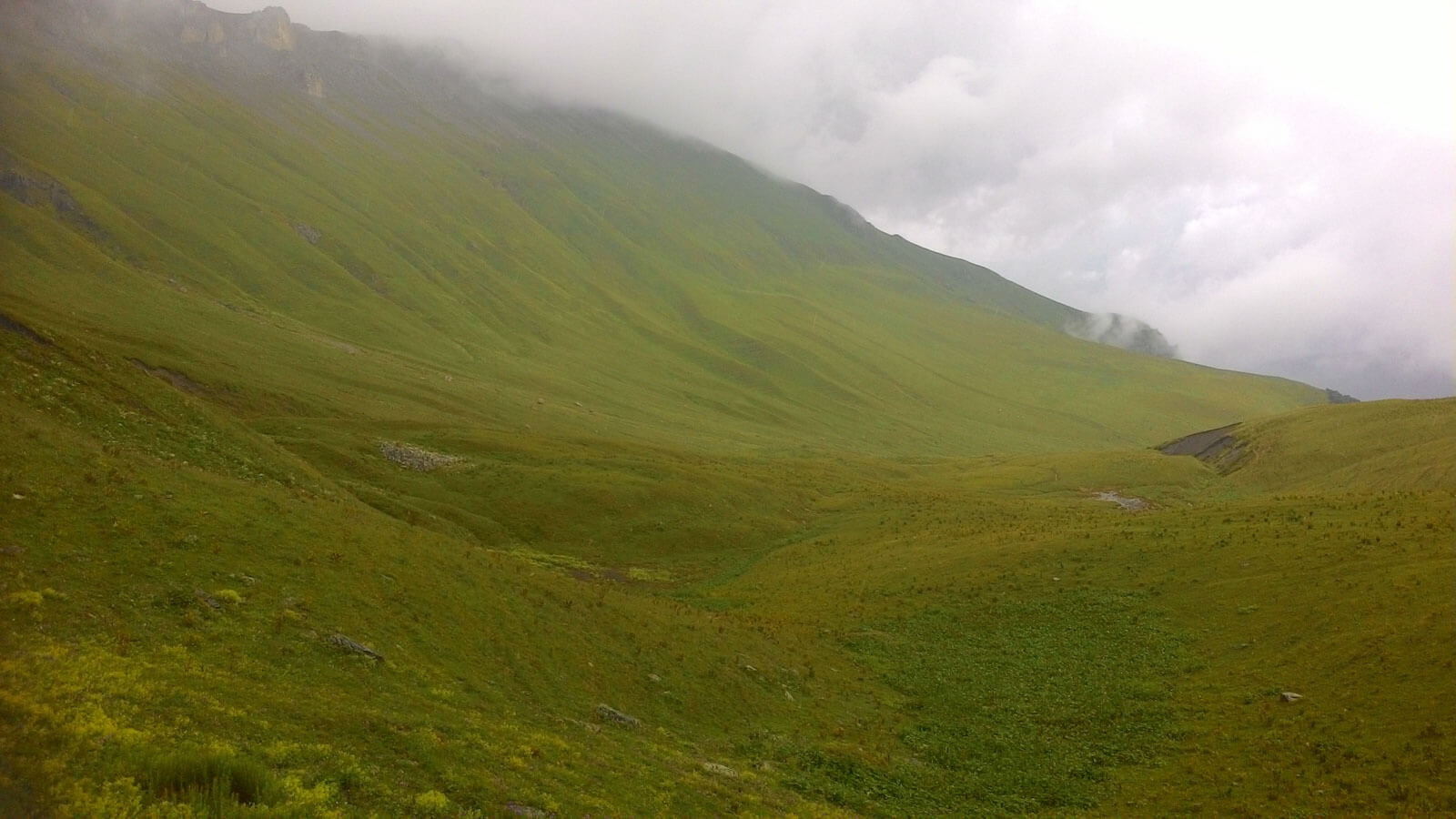 Перевалив через перешеек, перед нами предстала удивительная панорама долины. Трава была невысокой, будто её здесь подстригают каждый день.