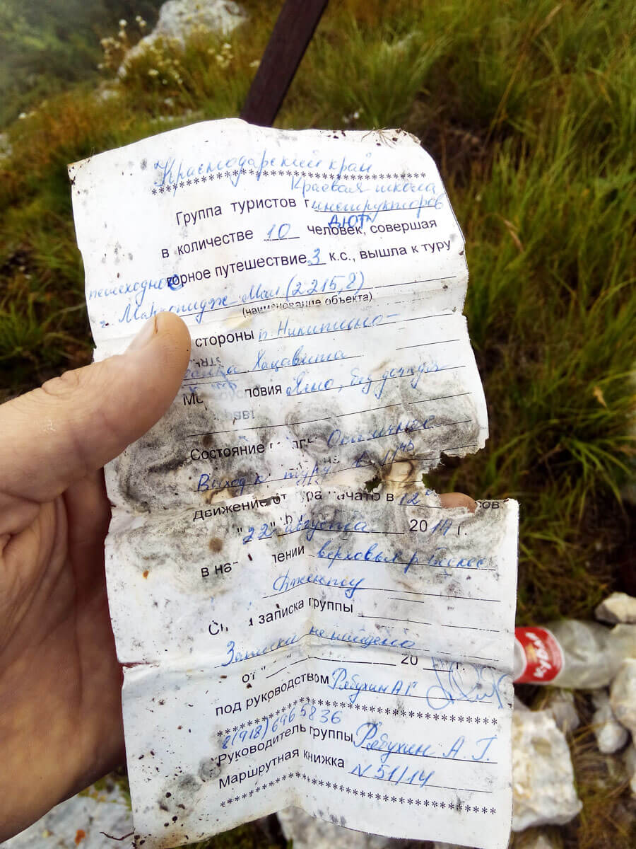 Взбираясь на эту вершину, мне даже посчастливилось увидеть в пяти метрах, резко выпрыгнувшую серну, которая вмиг скрылась за утёсом. Поднявшись, мы вгляделись в весь «коридор» долины Бескеса. А еще на вершине мы нашли банку с посланием от туристов из «недалекого прошлого».