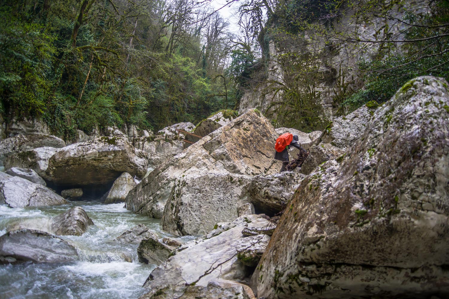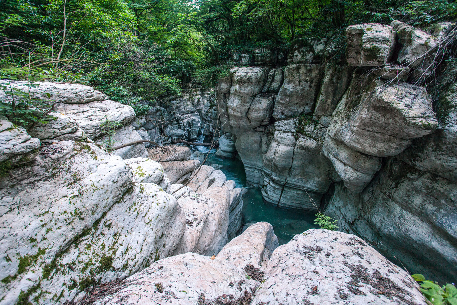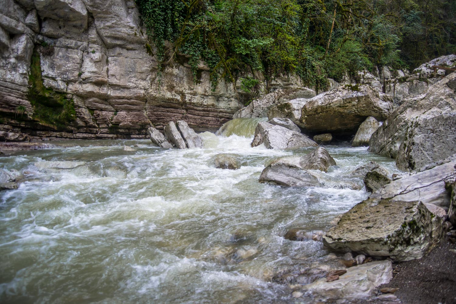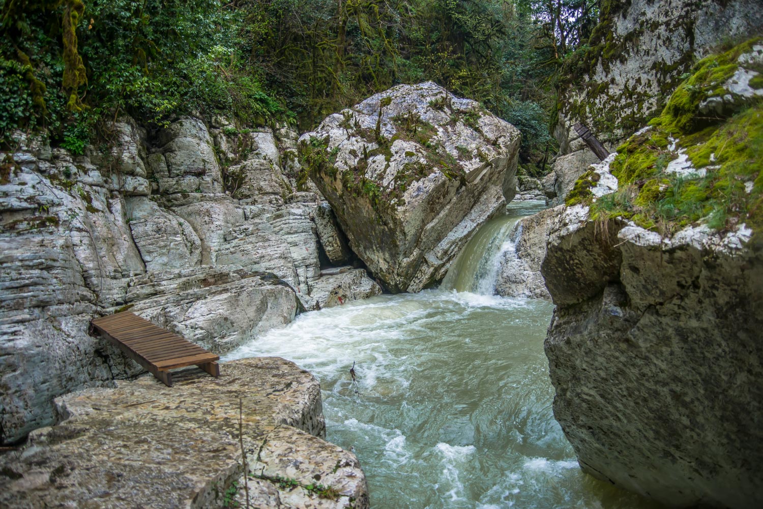 Для того, чтобы увидеть сам причудливый каньон реки Большая Хоста, нужно спуститься вниз. Тропа оборудована лестницами и поручнями.