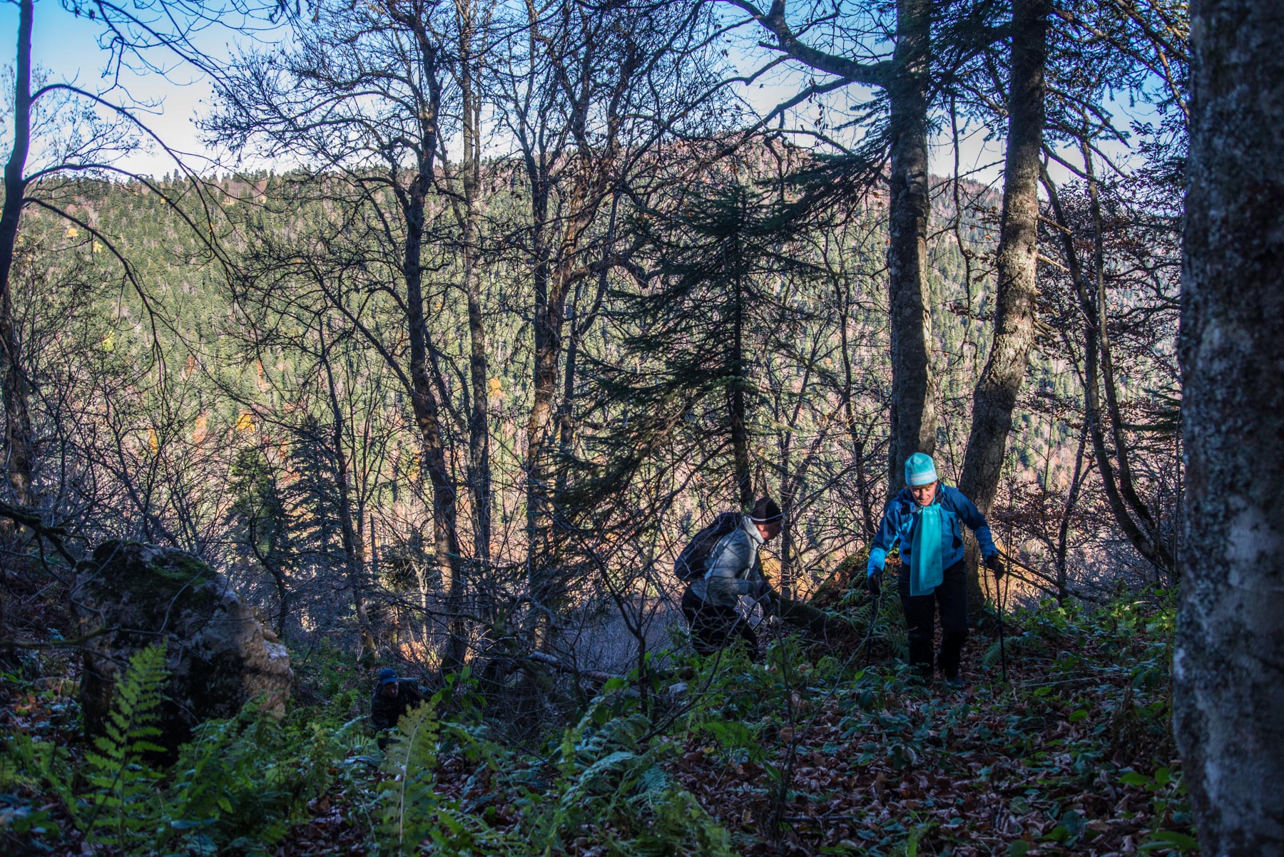В туристических навигаторах или приложениях для телефонов указано две тропы – одна левее, другая правее, но обе они ведут наверх того хребта, что перед вами. Лучше держаться правой дальней тропы, и лучше держаться ее четко. Потому что тропа есть только в навигаторе, а вот в лесу есть только заросли кустов, крапивы, крутые склоны и разбросанные на них камни. Ваша задача, следуя треку, попасть в узкий проход между скальными выступами, который приведет наверх. Сделать это с первого раза практически невозможно, поэтому не расстраивайтесь, если не получилось и просто ищите среди каменных завалов склонов пути обхода. Но и тот проход, что мы тут советуем далеко не так прост, как может показаться. Уклон местности иногда достигает 60 градусов, поэтому приходится карабкаться на четвереньках, цепляясь за камни и траву, крапиву. Чтобы сделать продвижение вверх комфортнее, возьмите с собой перчатки, это защитит руки от жгучей травы.