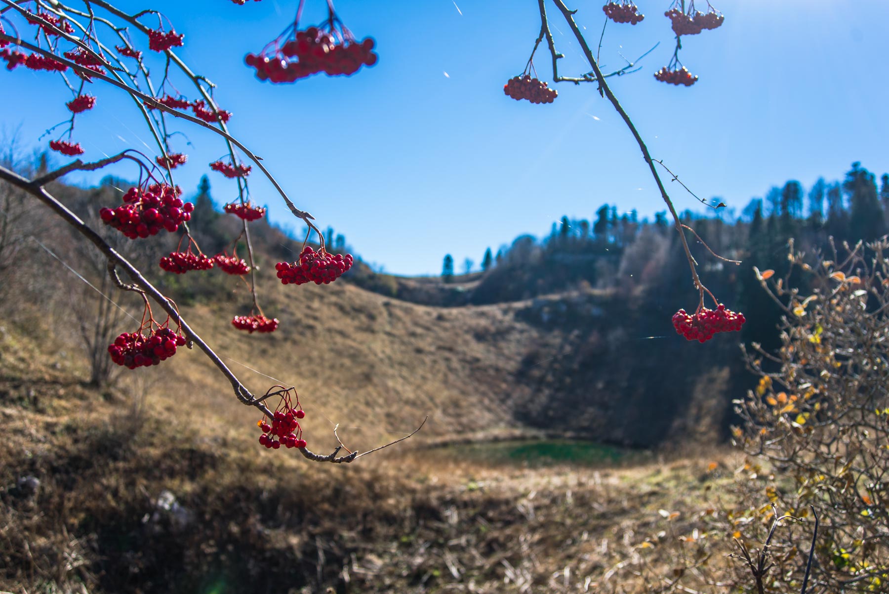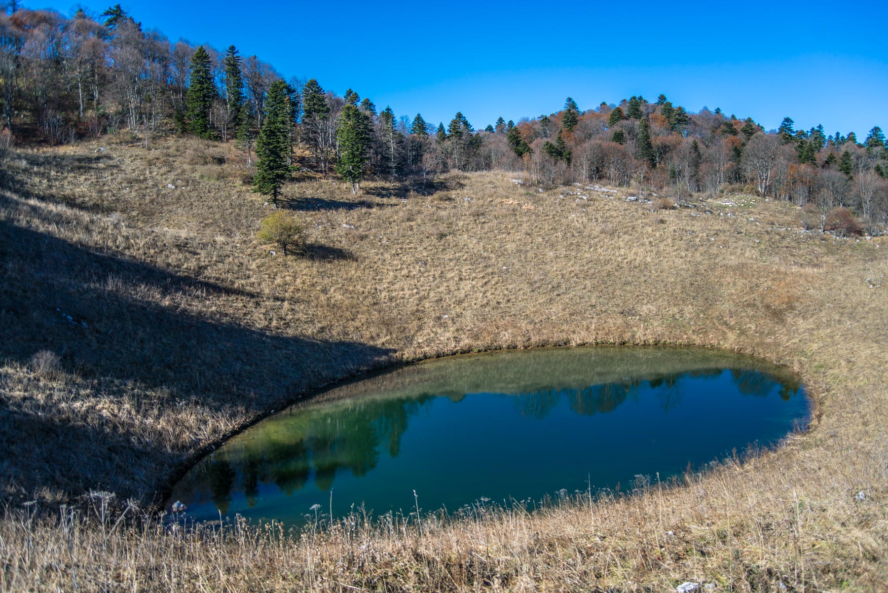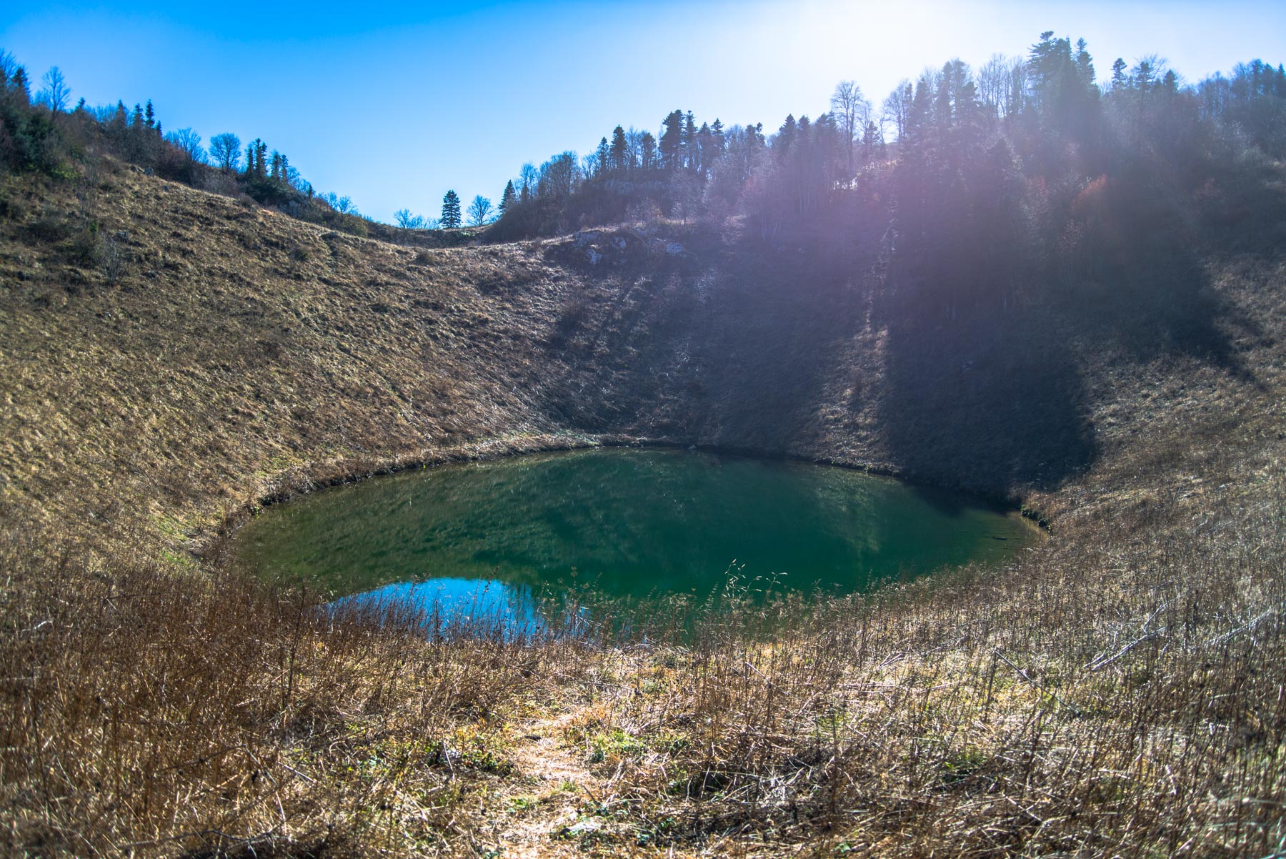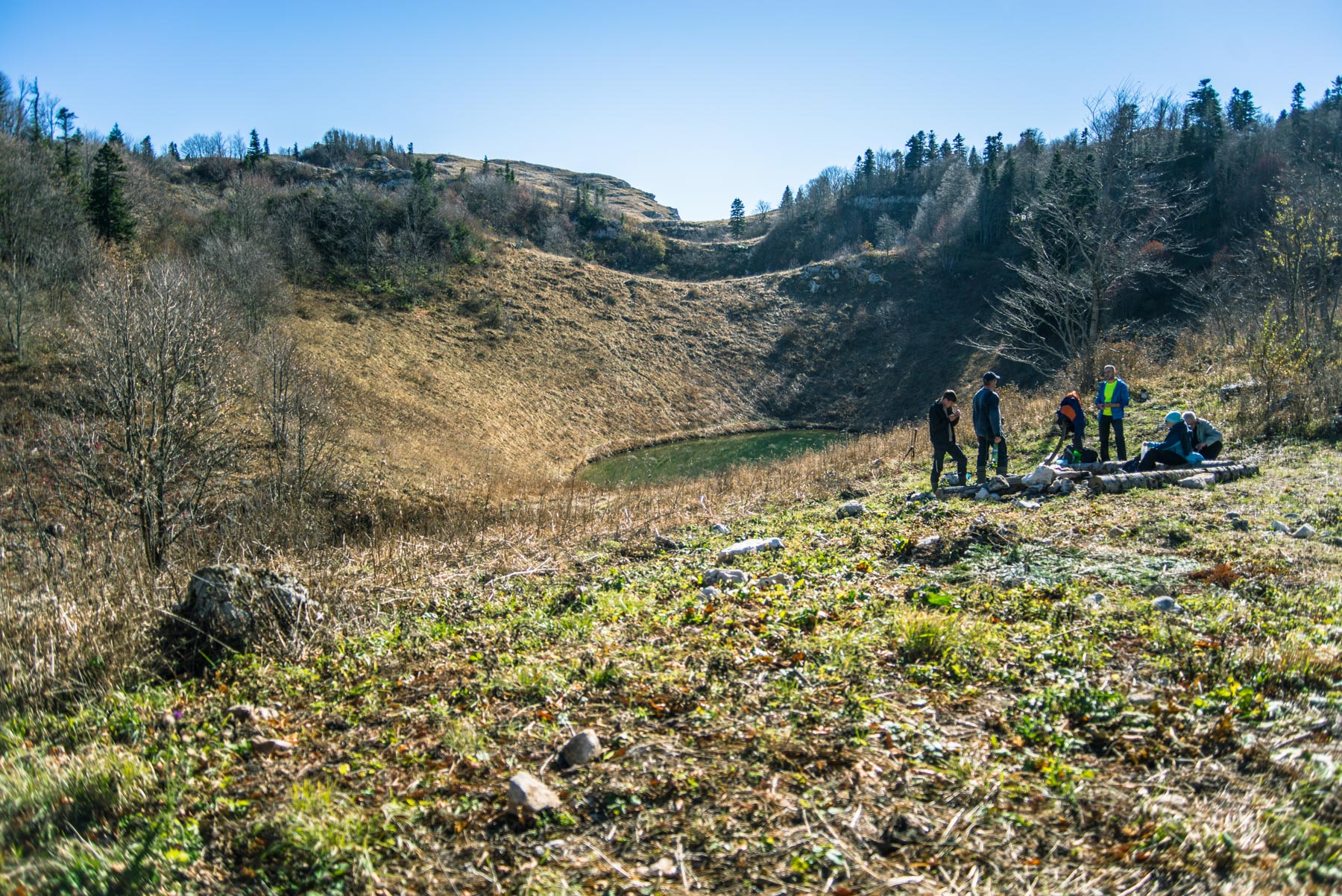 После того, как самый сложный участок преодолен, начинается чуть менее сложный, но все такой же непонятный – движение по лесному бурелому, кругом заросли травы, завалы камней и большое число карстовых воронок. Складывается впечатление, что здесь вообще никто никогда не ходил, настолько незаметно присутствие человека. В таком режиме от крутого подъема необходимо пройти еще километр. И вот, наконец, за очередным пригорком покажется озеро Чеше. Всего на этот путь уйдет около 3 часов.