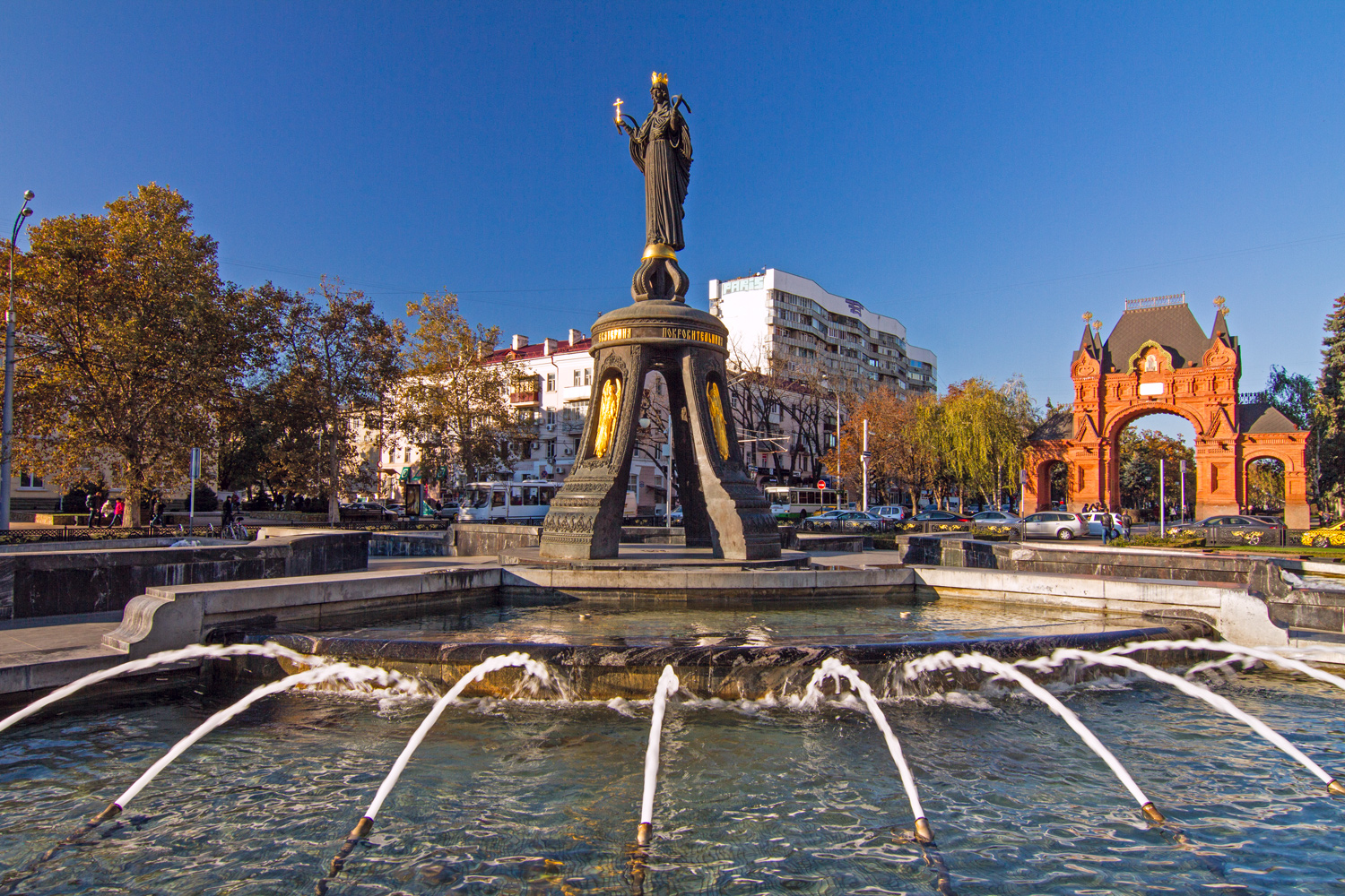 Памятник заступнице нашего города, открытый в 2009 году. Скульптурная композиция из памятника и фонтанов отлично дополняет Триумфальную арку, стоящую всего в нескольких метрах отсюда. Святая Екатерина считается покровительницей Краснодара, некоторые даже имеют основания думать, что первоначальное имя – Екатеринодар было дано городу в честь неё, а не императрицы Екатерины II.