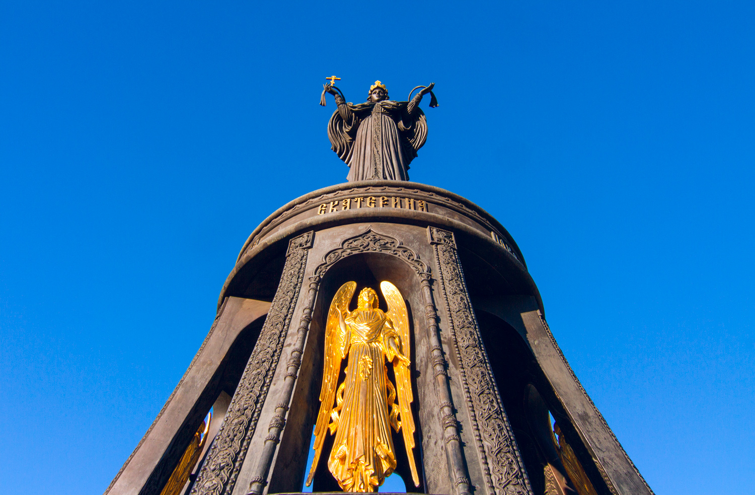 Сама скульптура выглядит как изваяние женщины в короне, стоящей на колоколе с огромными прорезями в нём. Московские архитекторы говорят, что специально задумали эти прорези так, чтобы любой мог пройти в них под скульптуру и оказаться непосредственно под покровом Екатерины. После этих слов, проход сквозь колокол стал как минимум доброй традицией у молодожёнов, приезжающей сюда по программе обязательных катаний свадебного дня.