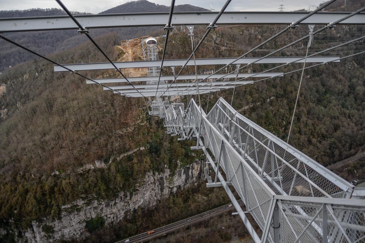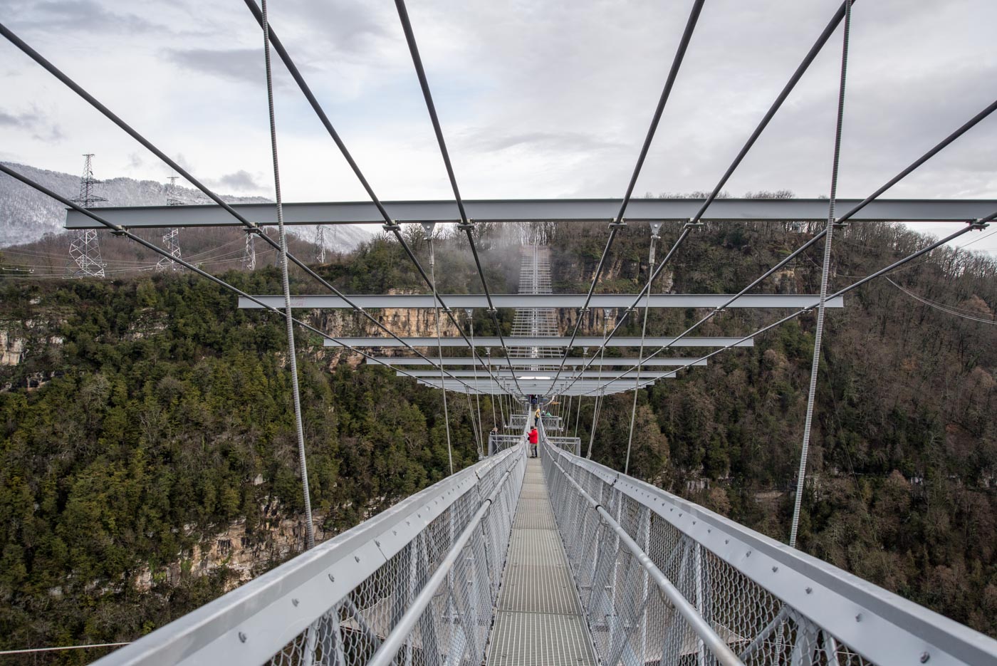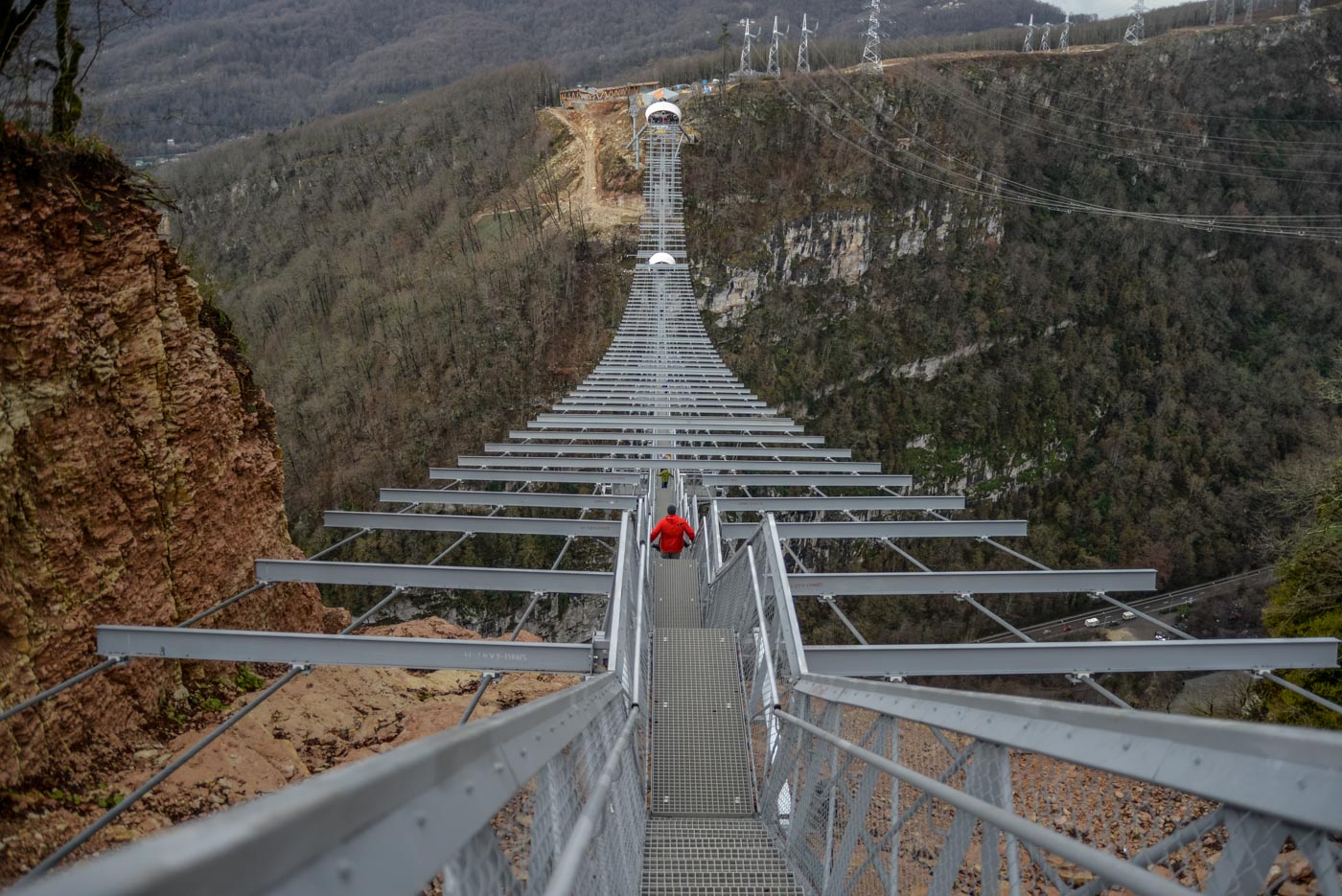 Недалеко от Красной Поляны, над Ахштырским ущельем раскинулся самый длинный пешеходный подвесной мост в мире, построенный здесь архитекторами из Новой Зеландии и России. Любой желающий может пройти по этому мосту и совершить прыжок с него. Удовольствие, конечно, не бесплатное. Мост никуда не ведет, на том конце вы не найдете населенного пункта или просто какой-то хозяйственный объект. Путь туриста заканчивается на площадке, огороженной колючей проволокой. Здесь установлен баннер с поздравлениями от человека, который это все придумал.