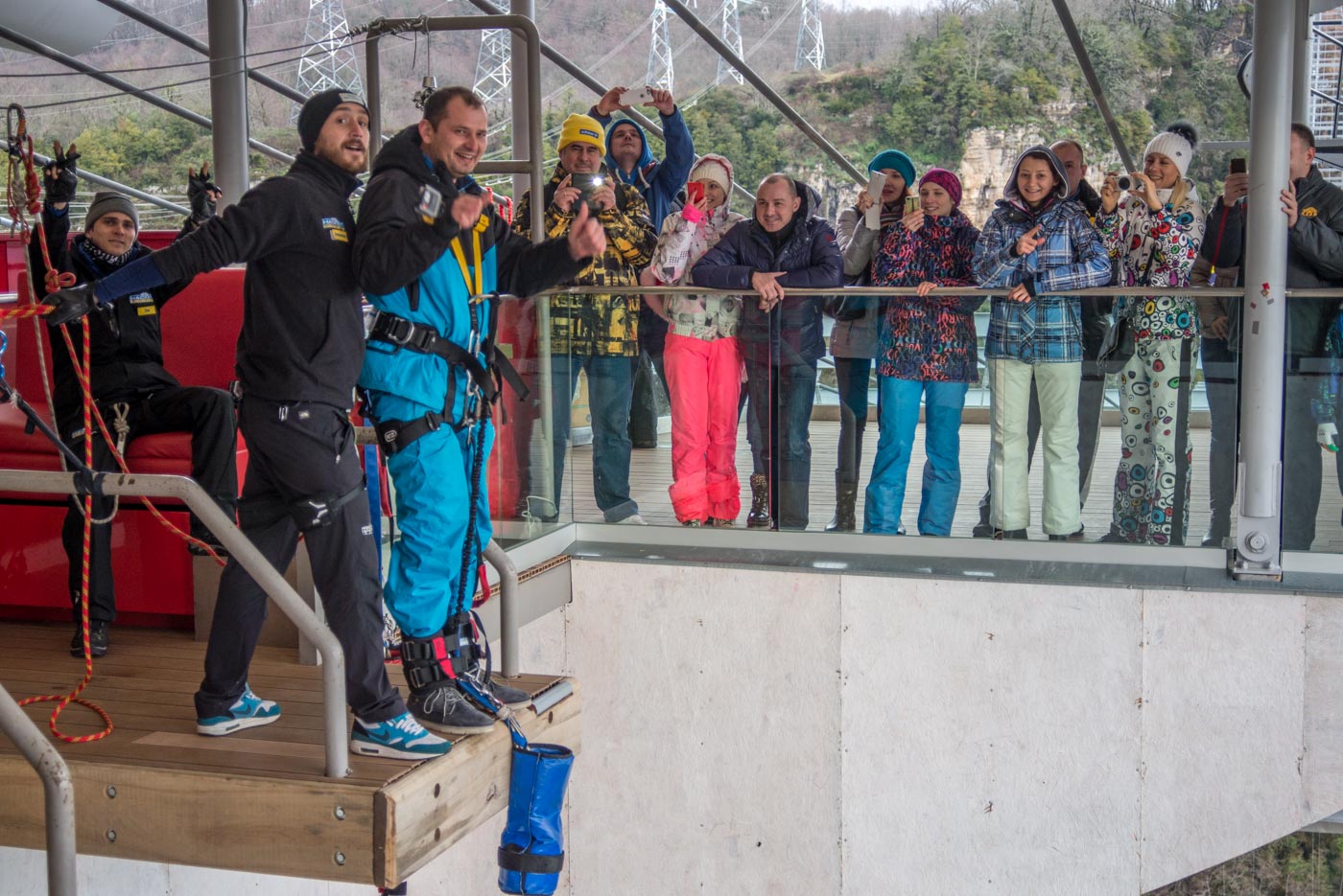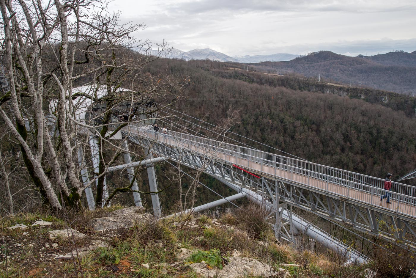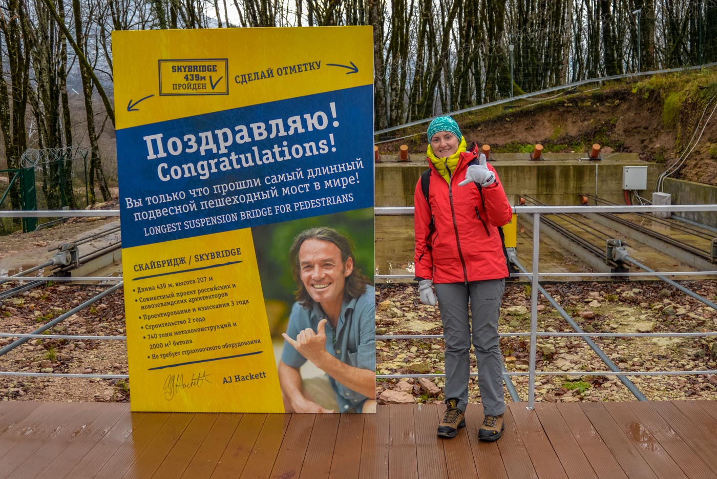 Недалеко от Красной Поляны, над Ахштырским ущельем раскинулся самый длинный пешеходный подвесной мост в мире, построенный здесь архитекторами из Новой Зеландии и России. Любой желающий может пройти по этому мосту и совершить прыжок с него. Удовольствие, конечно, не бесплатное. Мост никуда не ведет, на том конце вы не найдете населенного пункта или просто какой-то хозяйственный объект. Путь туриста заканчивается на площадке, огороженной колючей проволокой. Здесь установлен баннер с поздравлениями от человека, который это все придумал.