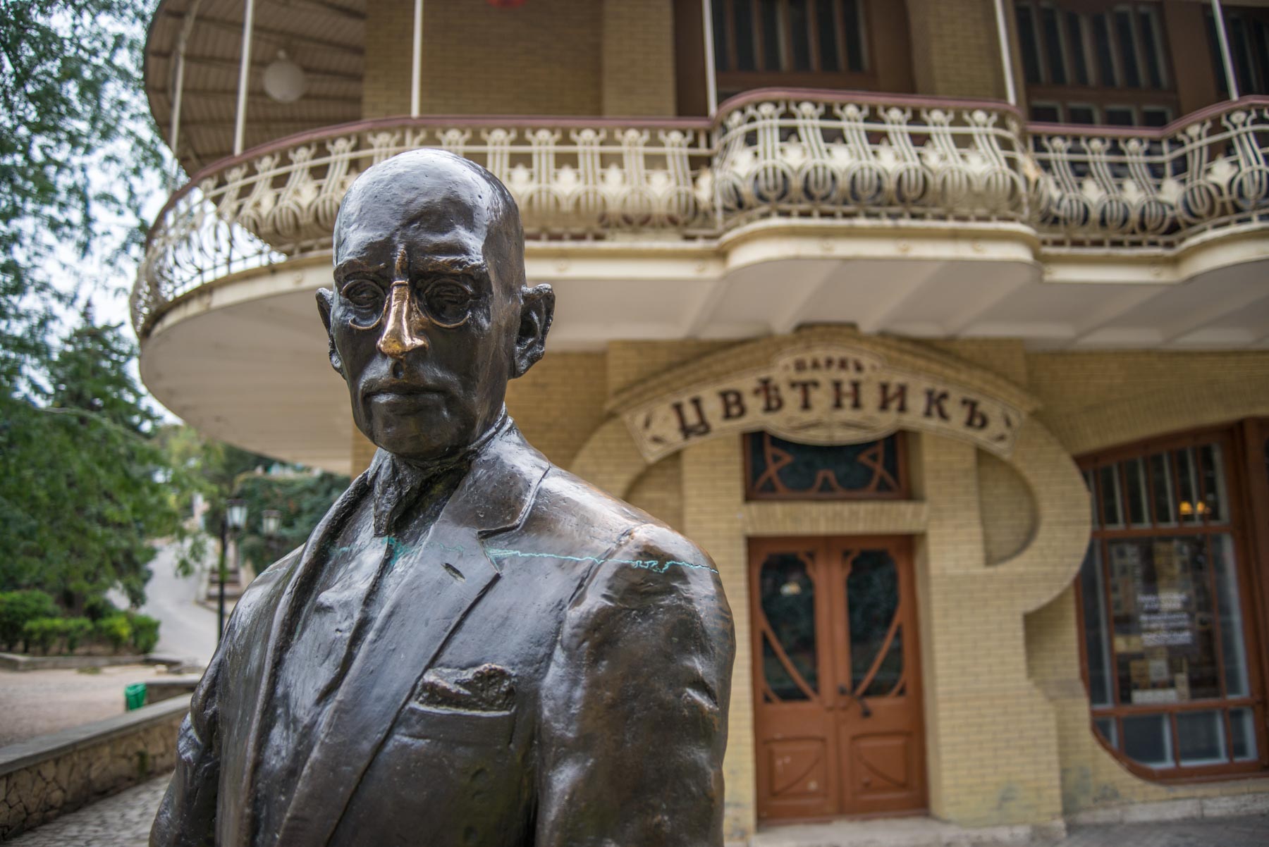Вход в «Цветник» – это железная арка, справа от которой находится красивое здание – Кофейня Гукасова. Именно под стенами кофейни и просит милостыню Киса Воробьянинов.