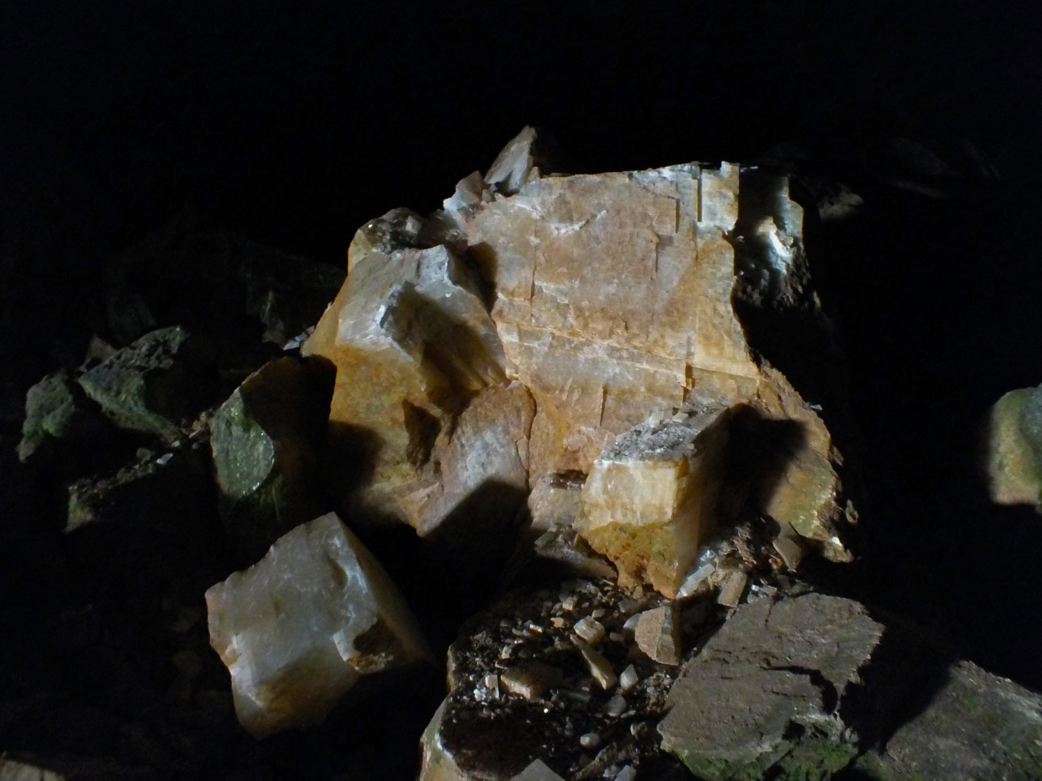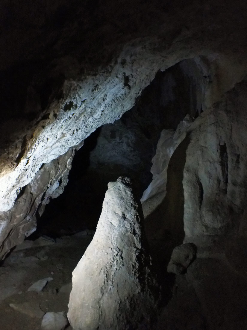 Сечение сложное, вначале — трапециевидное, далее потолок, сужаясь, уходит щелью вверх. Из натеков встречаются практически все разновидности, но в небольшом количестве.