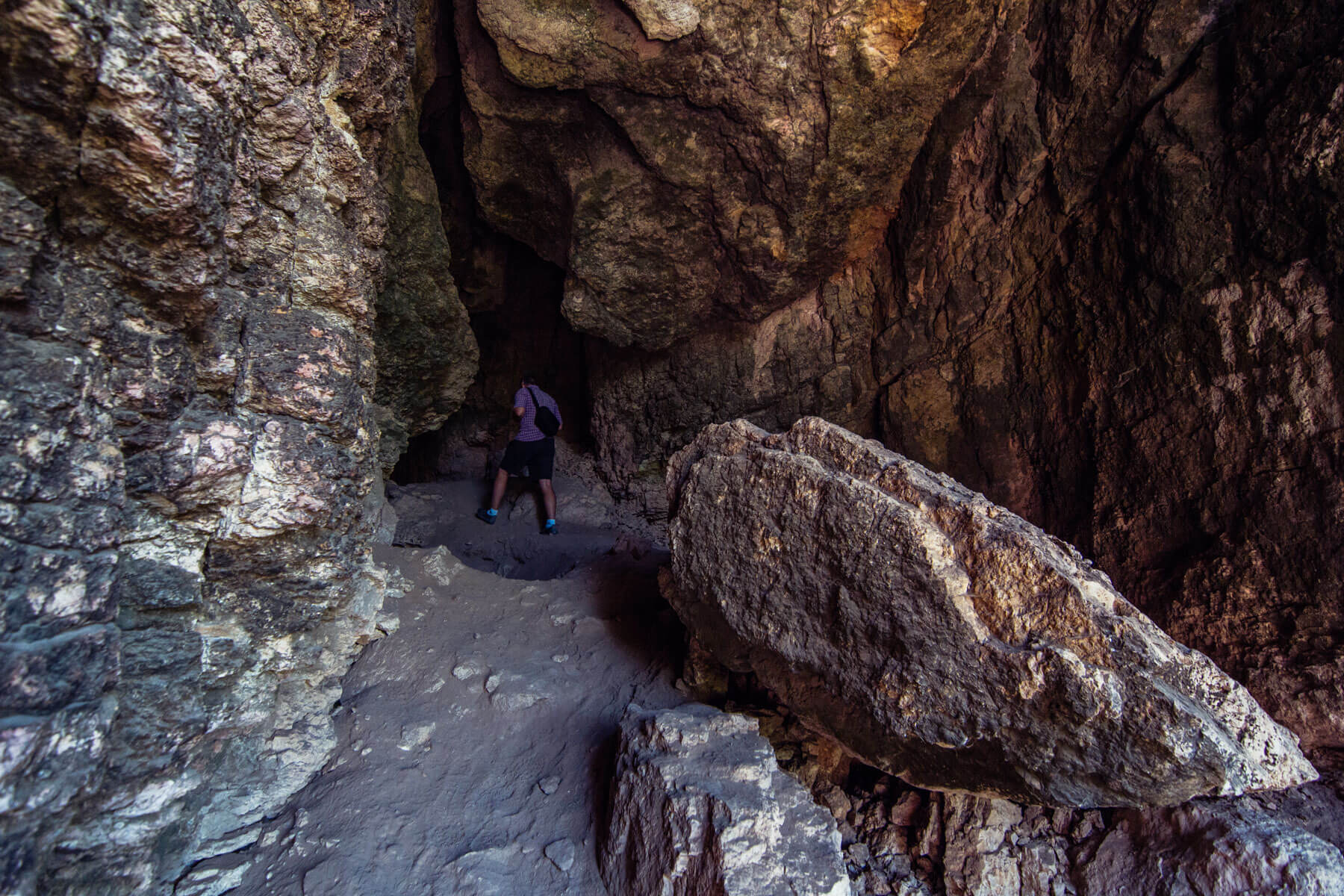 Переща Пыльная находится неподалеку от скалы Чертов палец, вход в пещеру видно с тропы, не доходя 500 м до скалы. Вход в пещеру представляет собой большой треугольный разлом с каменными завалами в начале. Внутри пещера абсолютно сухая, вследствие чего пыльная, чем и оправдывает свое название. Длина пещеры составляет около 30 м, по некоторым сведениям, она продолжается и дальше – узкий лаз выводит в еще один зал.