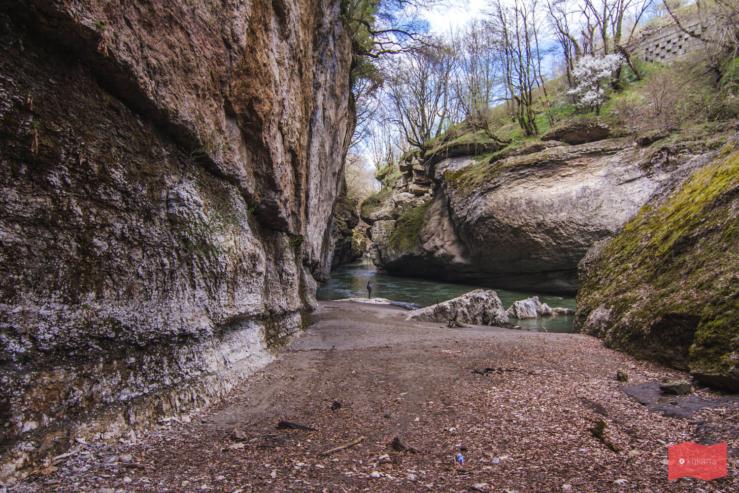 Чуть дальше «официального» входа в Хаджохскую теснину любопытные туристы могут обнаружить широкий песчаный пляж. Это очень красивое место и есть начало расщелины, его обязательно стоит посетить ради ярких впечатлений и необычных фотографий. Отсюда открывается шикарный вид на теснину – скалы нависают над водами реки Белой, а та, в свою очередь, постоянно меняет цвет в зависимости от погоды.