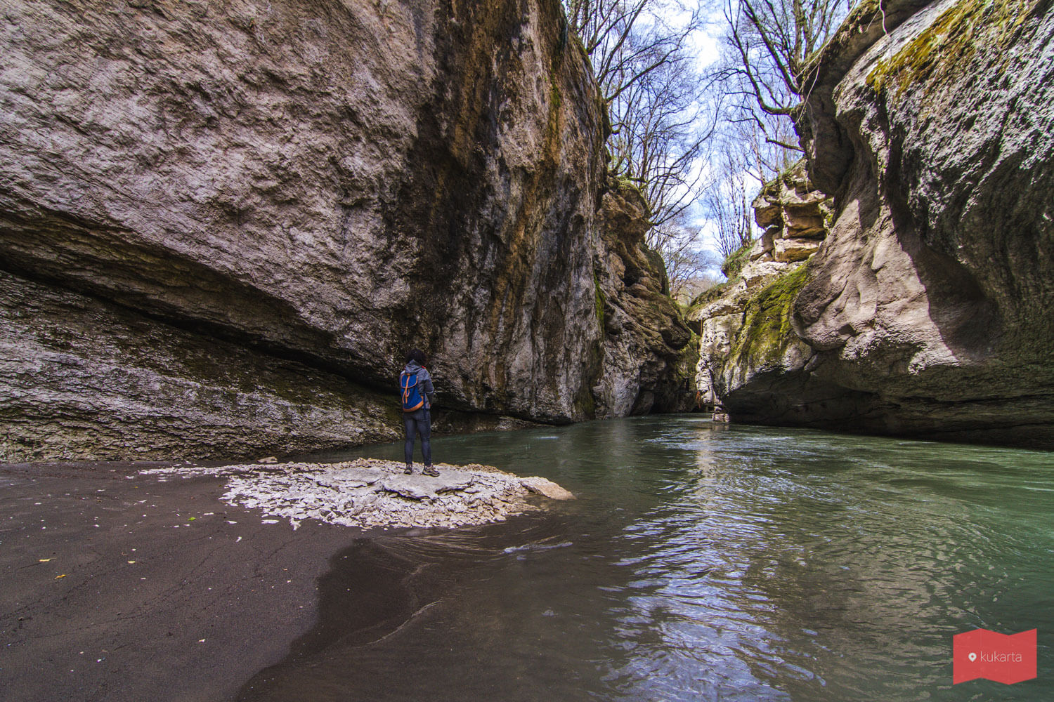 Старт маршрута начинается немного дальше входа в теснину для экскурсий. Не пытайтесь оставить машину напротив входа в ущелье, даже не заезжая за шлагбаум – к вам все равно прибежит охранник и попросит ее убрать. Но рядом есть другие места, где можно припарковаться без проблем. Отсюда до пляжа приблизительно 550 метров, тропа набита и потеряться невозможно. В одном месте дорожка крутой уйдет налево вниз – это и есть спуск. Если пройти по тропе дальше, то можно выйти на водопады Руфабго.